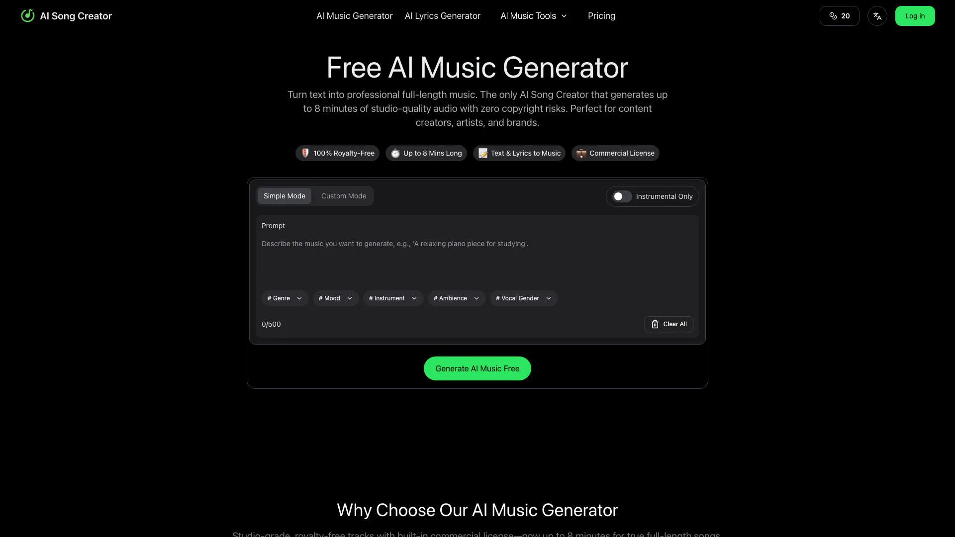 - Generates Full-Length Songs: The AI Song Creator allows users to create songs up to 8 minutes long, providing a full-length experience rather than short loops.