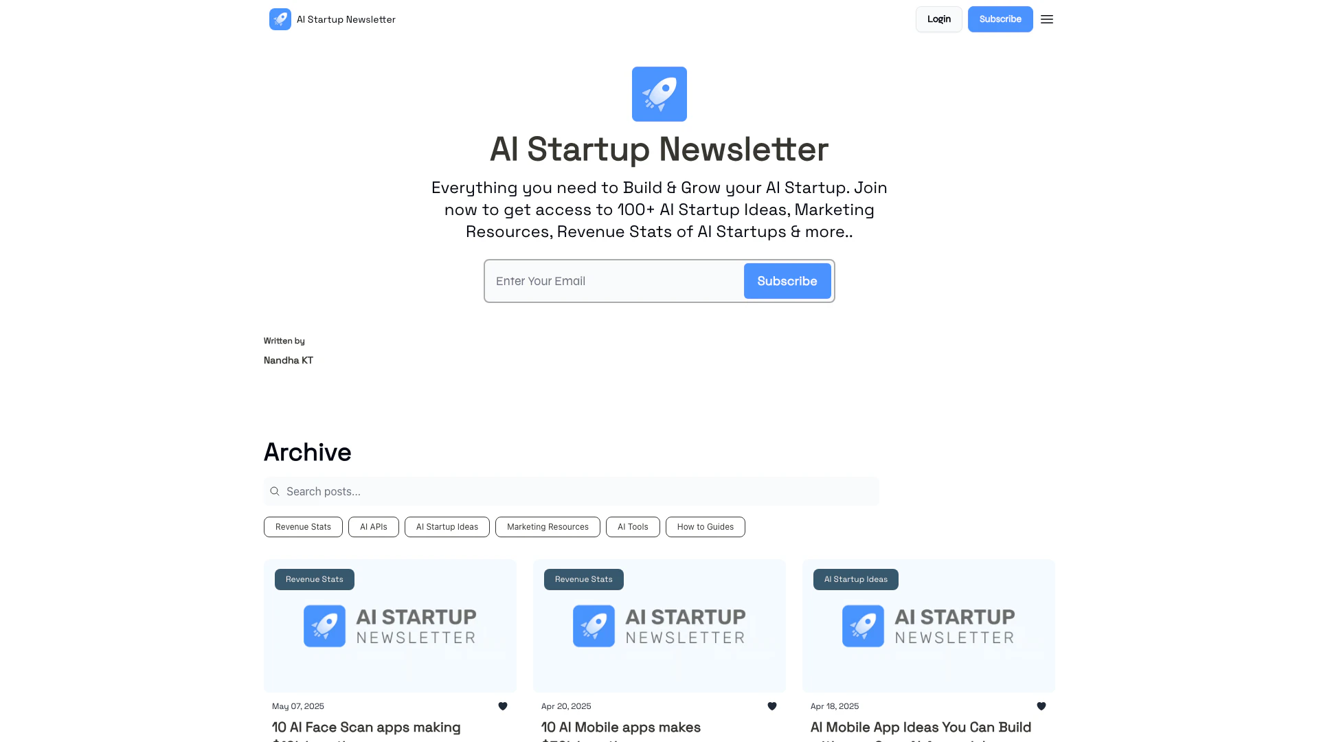 The AI Startup Newsletter provides everything you need to build and grow your AI startup, including access to 100+ AI startup ideas, marketing resources, and revenue statistics of AI startups.