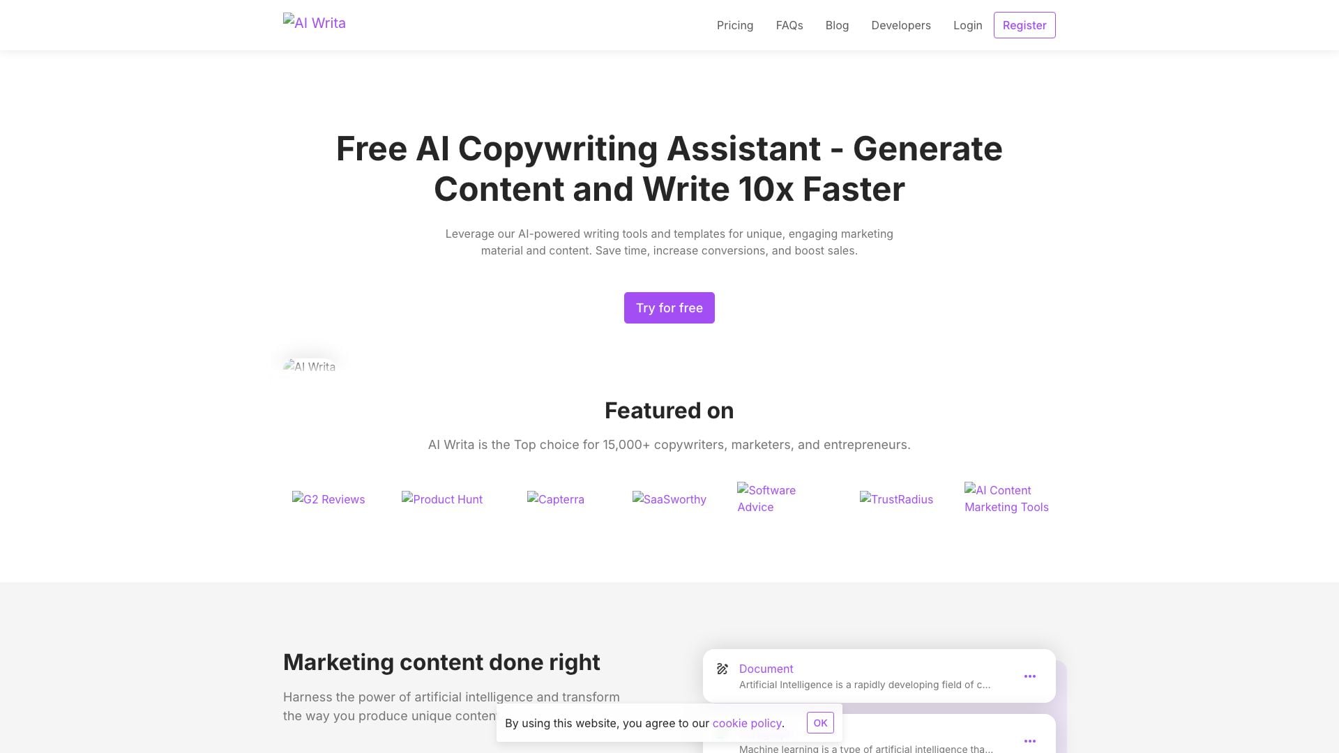 AI Writa - Free AI Copywriting Assistant | Generate Content and Write 10x Faster