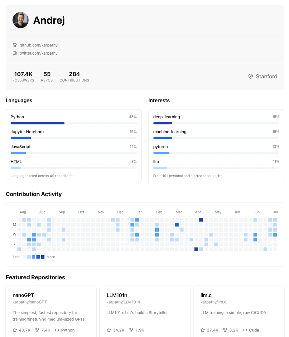 - Easy to Skim Profiles: View automatic summaries of developers' skills and activity for efficient evaluation.