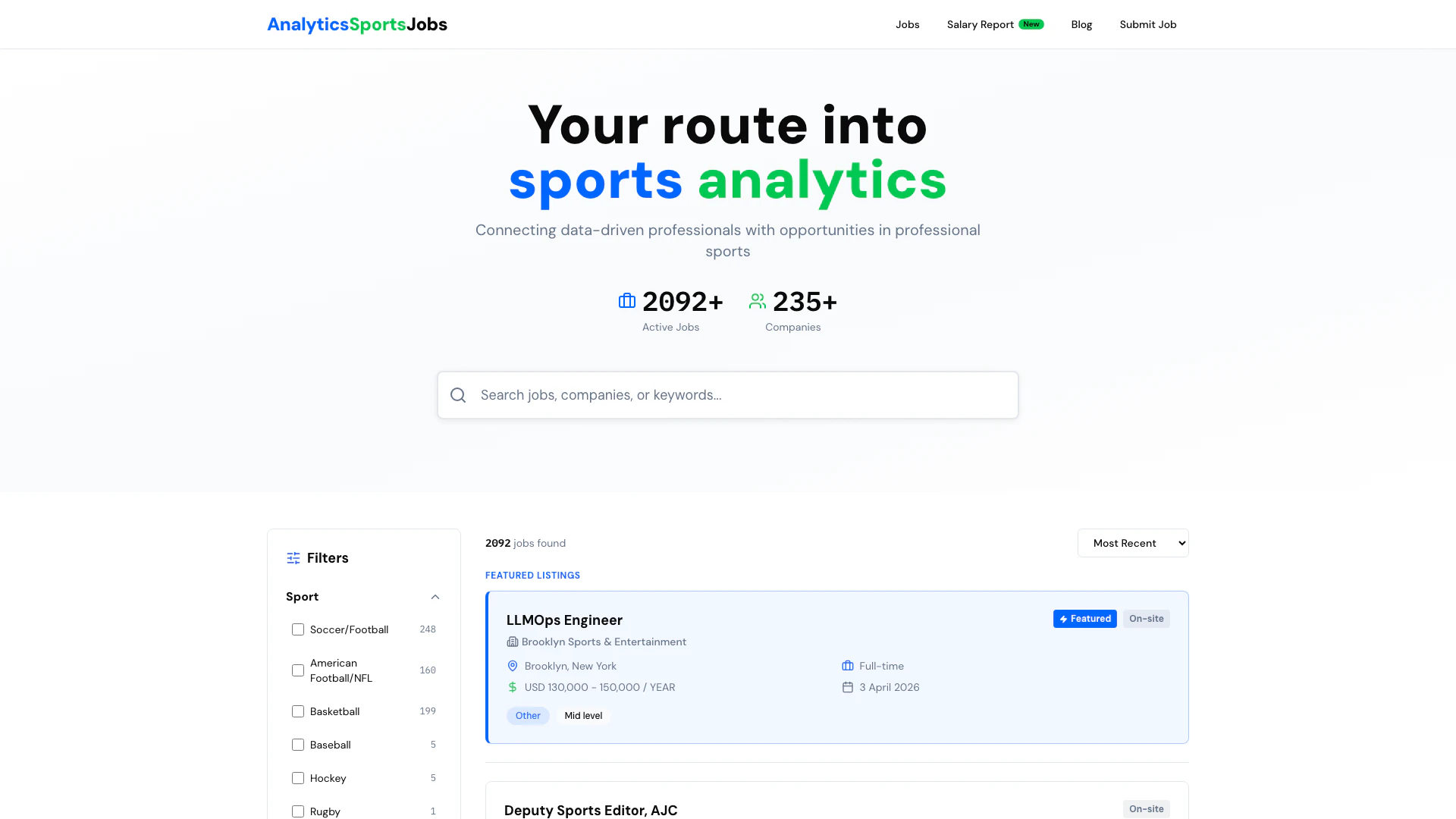 Analyticssportsjobs is a dedicated job board[4] designed to connect data-driven professionals with opportunities in the sports analytics[1] field. It specializes in listing hundreds of job openings related to sports analytics, data science[2], and performance analysis[3] across various professional sports leagues, including the NFL, NBA, and MLS. Updated daily, the platform provides users with access to the latest job postings from top teams and organizations, making it an essential resource for those looking to advance their careers in sports analytics.