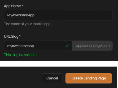 - Create your page: Enter your app name and store links to generate your landing page in seconds.