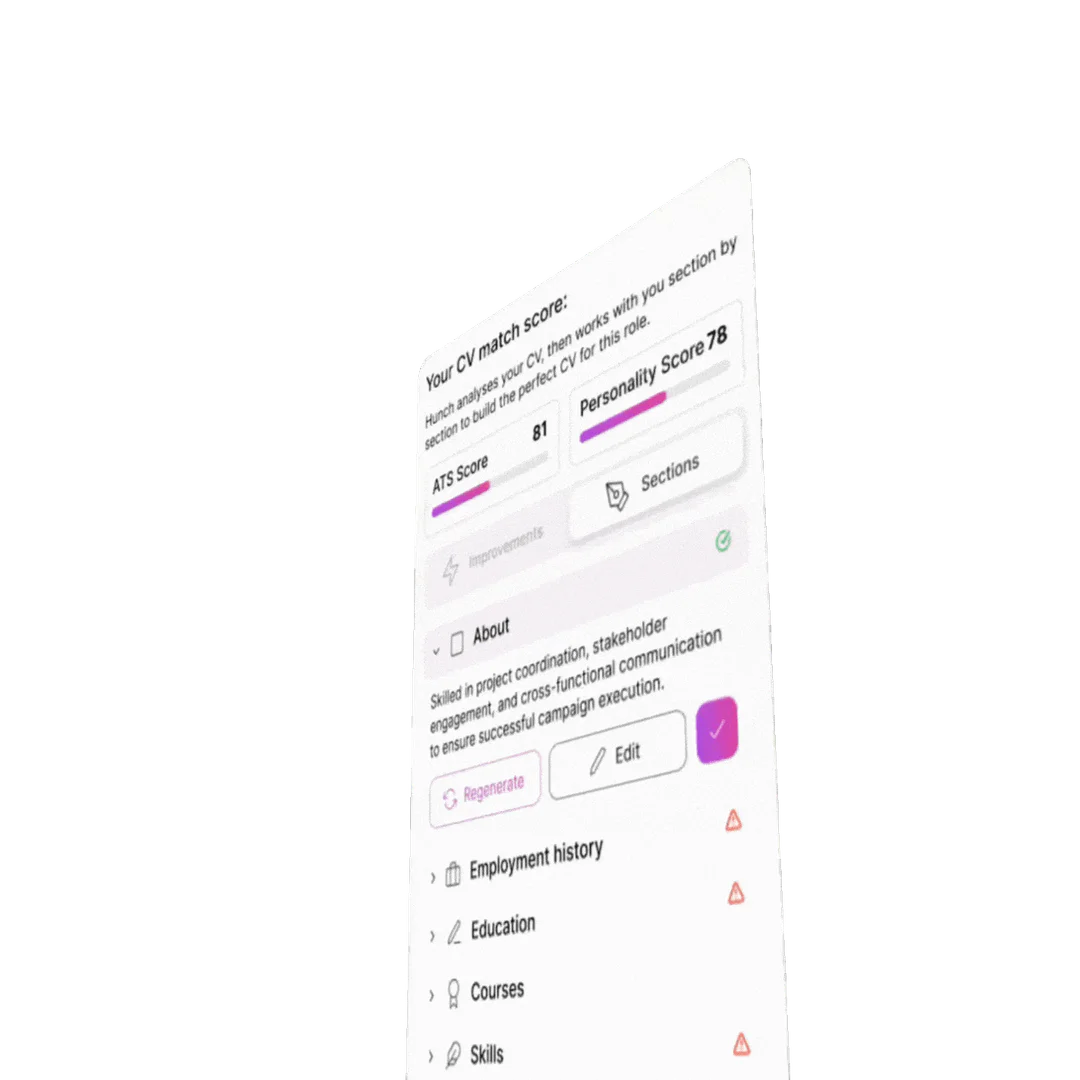 Hunch is an AI-powered platform designed to assist graduates in finding jobs by matching their skills and experiences with job listings, creating CVs and cover letters, and preparing them for interviews.
