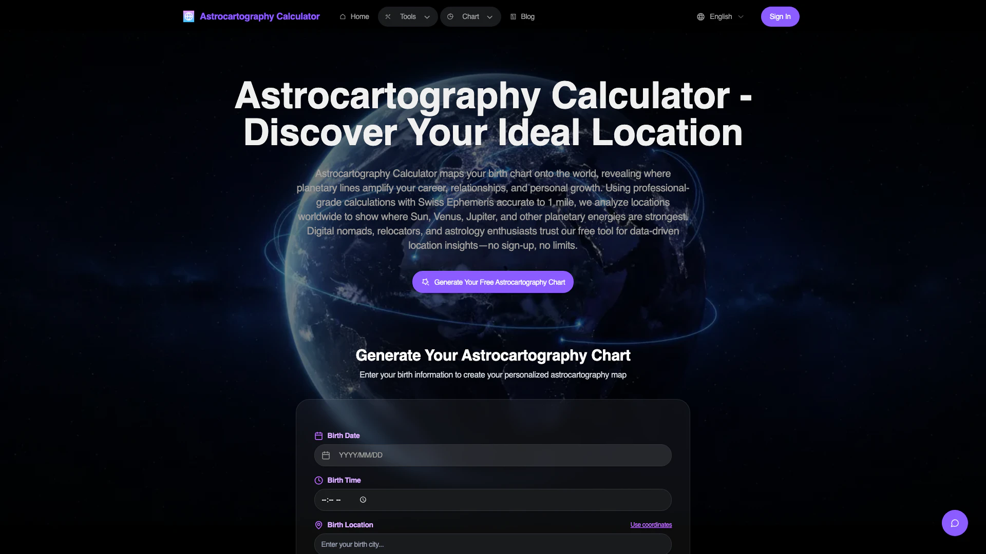 Astrocartography is a specialized astrological tool that projects your birth chart onto a global map, revealing where the planets were positioned at the time of your birth. Utilizing advanced AI technology, the Astrocartography Calculator provides precise planetary lines, relocation insights, and instant map interpretations without the need for sign-ups or advertisements. This tool is designed to enhance your understanding of how planetary energies influence different geographical locations, allowing for practical applications in personal and professional planning.