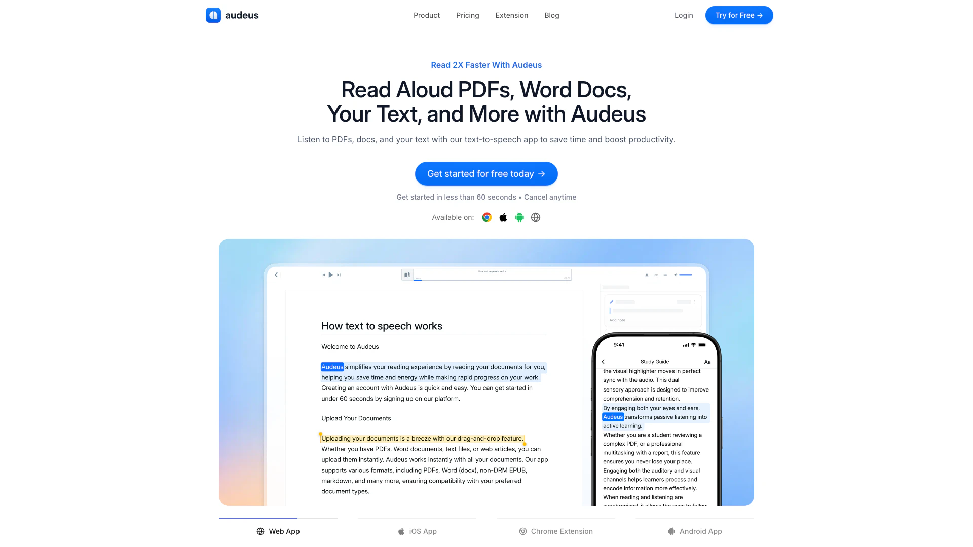 Audeus is an immersive text-to-speech (TTS) reader designed to enhance productivity by converting written text from various formats such as PDFs, Google Docs, and Word documents into spoken audio. This innovative tool allows users to listen to their documents while following along with the highlighted text, making reading more efficient and less strenuous. Audeus aims to help individuals manage their reading tasks effectively, whether for study, work, or personal use, enabling them to accomplish more in less time.