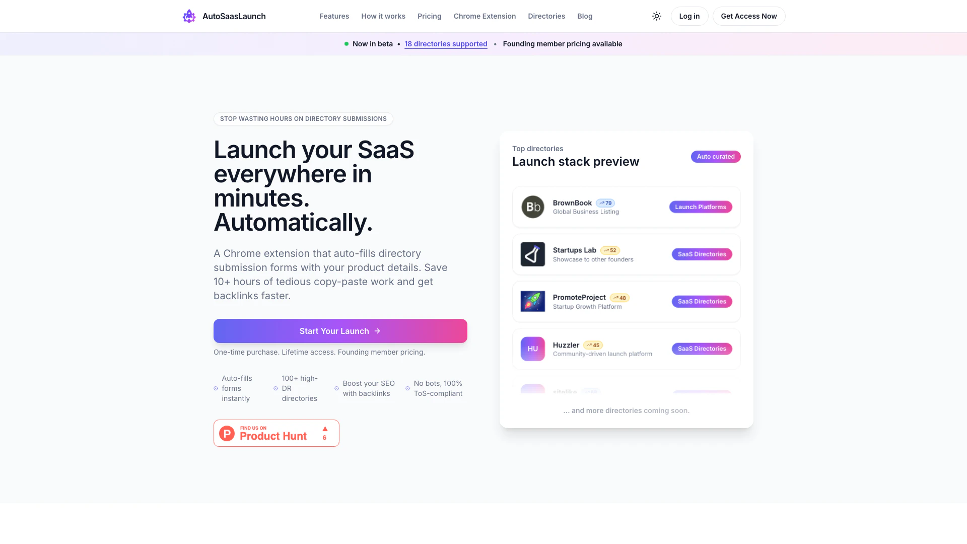 AutoSaaSLaunch is an innovative tool designed to automate the process of submitting your SaaS product to various online directories. This tool is particularly beneficial for founders and entrepreneurs who want to streamline their launch process[5], saving valuable time and effort. By utilizing a Chrome extension[1], AutoSaaSLaunch can auto-fill directory submission forms with your product details, significantly reducing the time spent on repetitive tasks such as copy-pasting. With this tool, you can launch your SaaS products in minutes rather than days, ensuring that you focus more on building and growing your business.