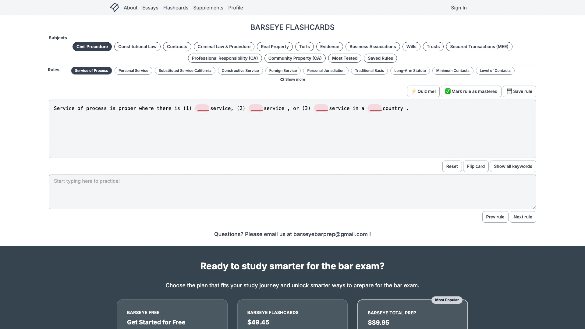 Explore flashcards and practice essays with Civil Procedure to start your bar prep journey. Includes study Civil Procedure rule statements, flashcard features, practice typing black letter law, access to study supplements, and timed practice essays.