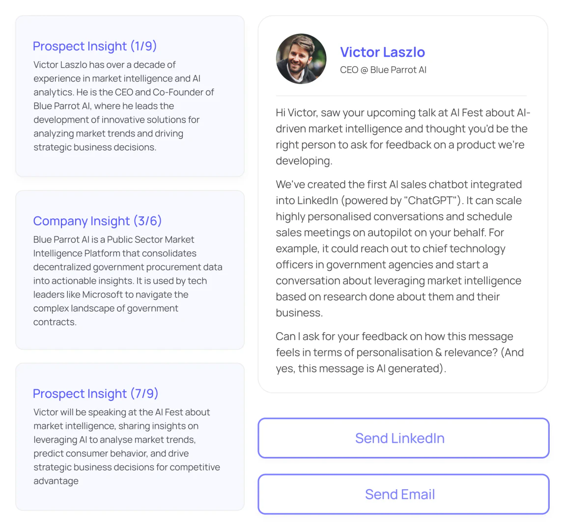 - AI-Powered Messaging: Bella generates personalized messages based on in-depth research about each prospect.