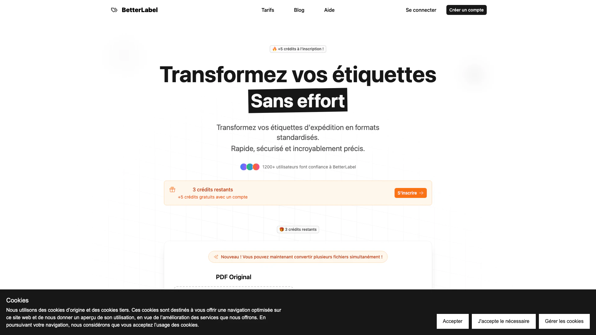 Better-label is a free online tool designed to convert shipping labels[1] from various carriers such as Mondial Relay, UPS, Chronopost, Colis Privé, Vinted Go, Relais Colis, and Colissimo from A4 to A6[2] format. This solution is quick, reliable, and specifically tailored for users who need to resize shipping labels for thermal printer[3]s. With automatic carrier detection[4], Better-label simplifies the process of preparing shipping labels, ensuring efficiency and accuracy for over 1200 users.
