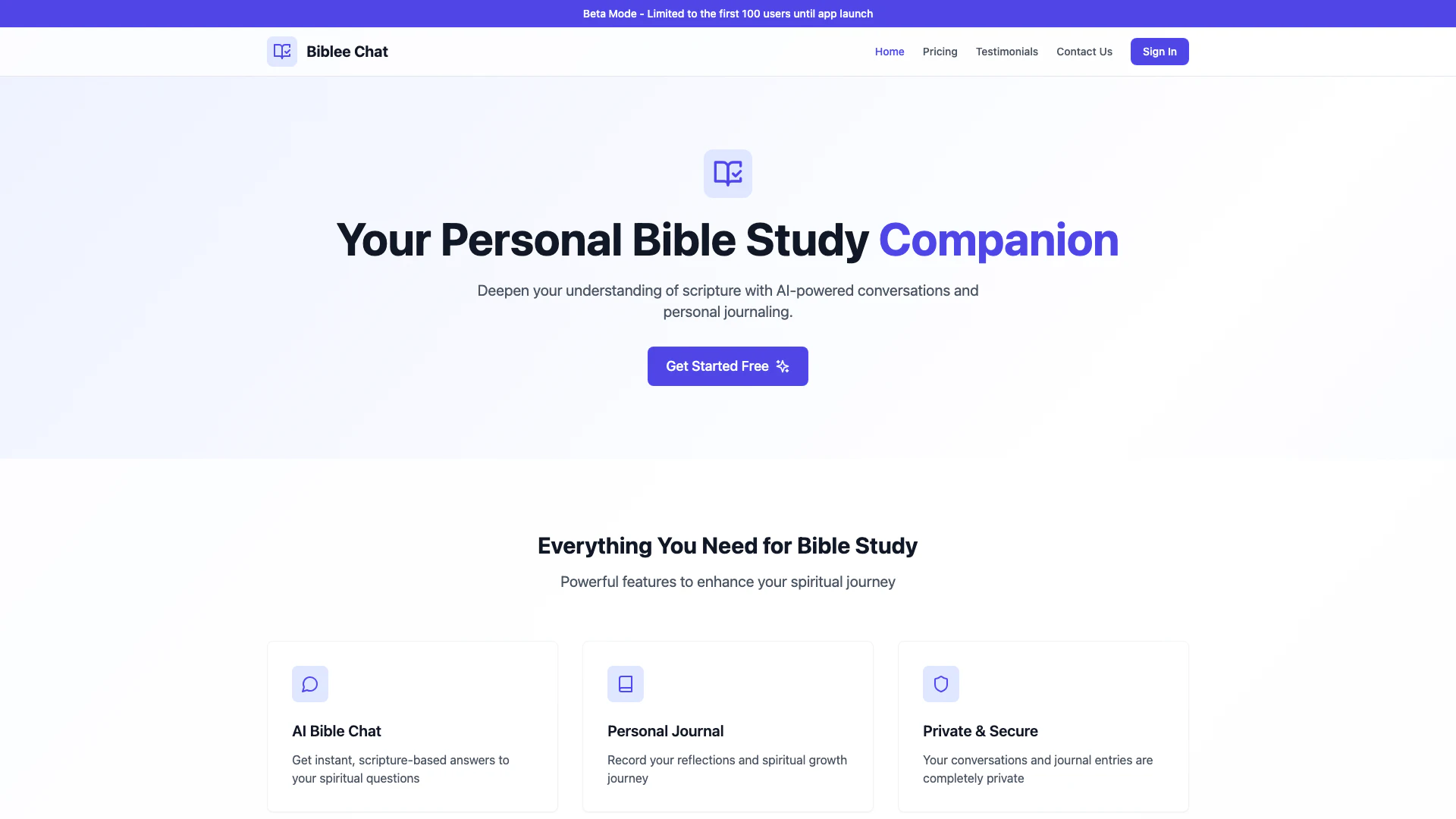 Bibleechat is an innovative AI-powered tool designed to enhance your personal Bible study experience. It serves as your personal Bible study companion, providing instant, scripture-based answers to your spiritual questions and allowing users to maintain a personal journal for reflections and spiritual growth. With a focus on privacy and security, Bibleechat ensures that all conversations and journal entries remain confidential, making it a trusted resource for believers seeking to deepen their understanding of scripture.