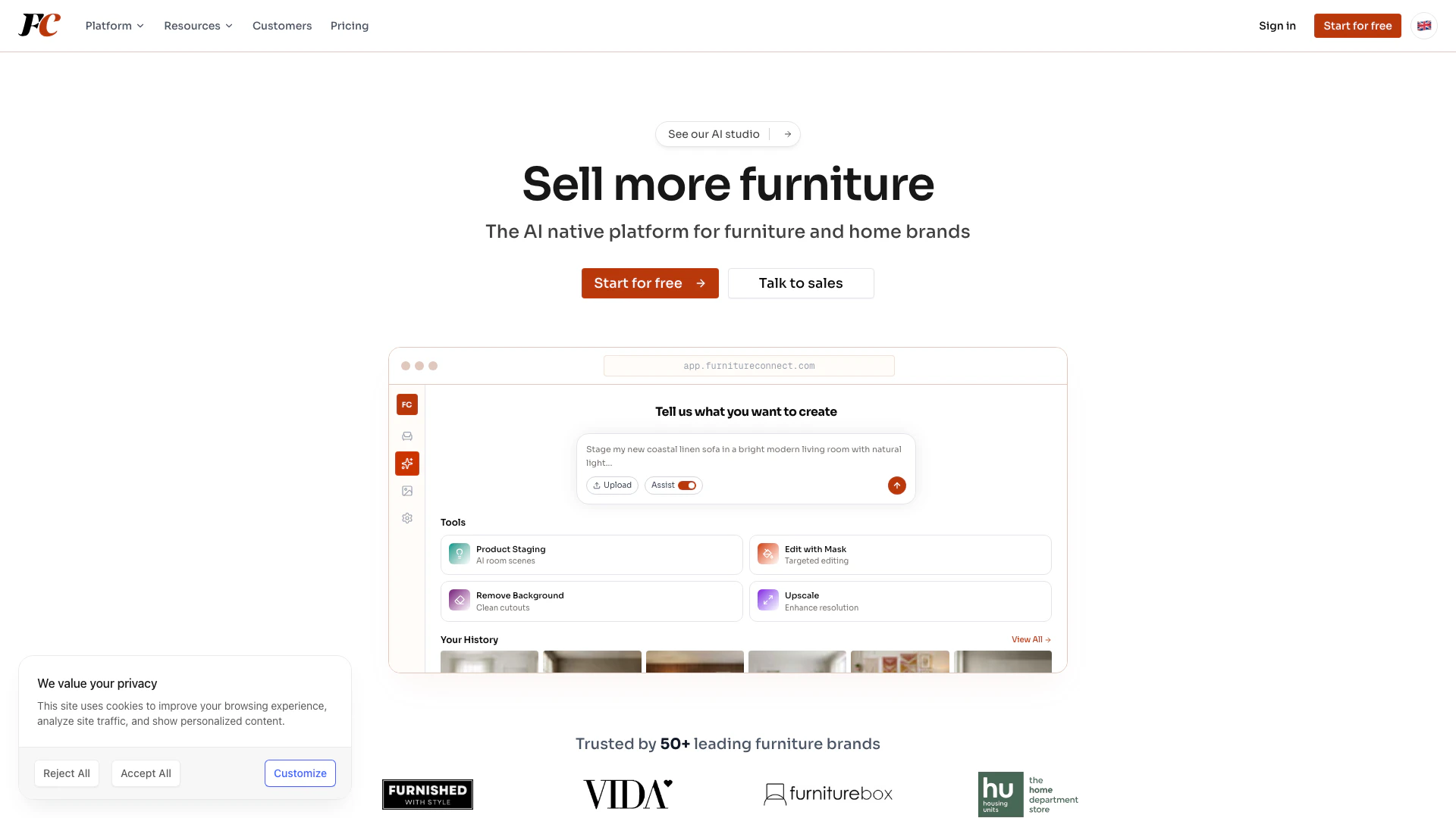 Bigteamai is an innovative AI-powered[1] platform designed specifically for the furniture industry. It enables users to transform furniture photos into stunning lifestyle images[3], generate consistent product imagery[4], and remove backgrounds, all while significantly reducing the time and cost associated with traditional photography. With Bigteamai, furniture brands can create visually appealing content 10 times faster, allowing them to enhance their marketing efforts and improve their online presence.