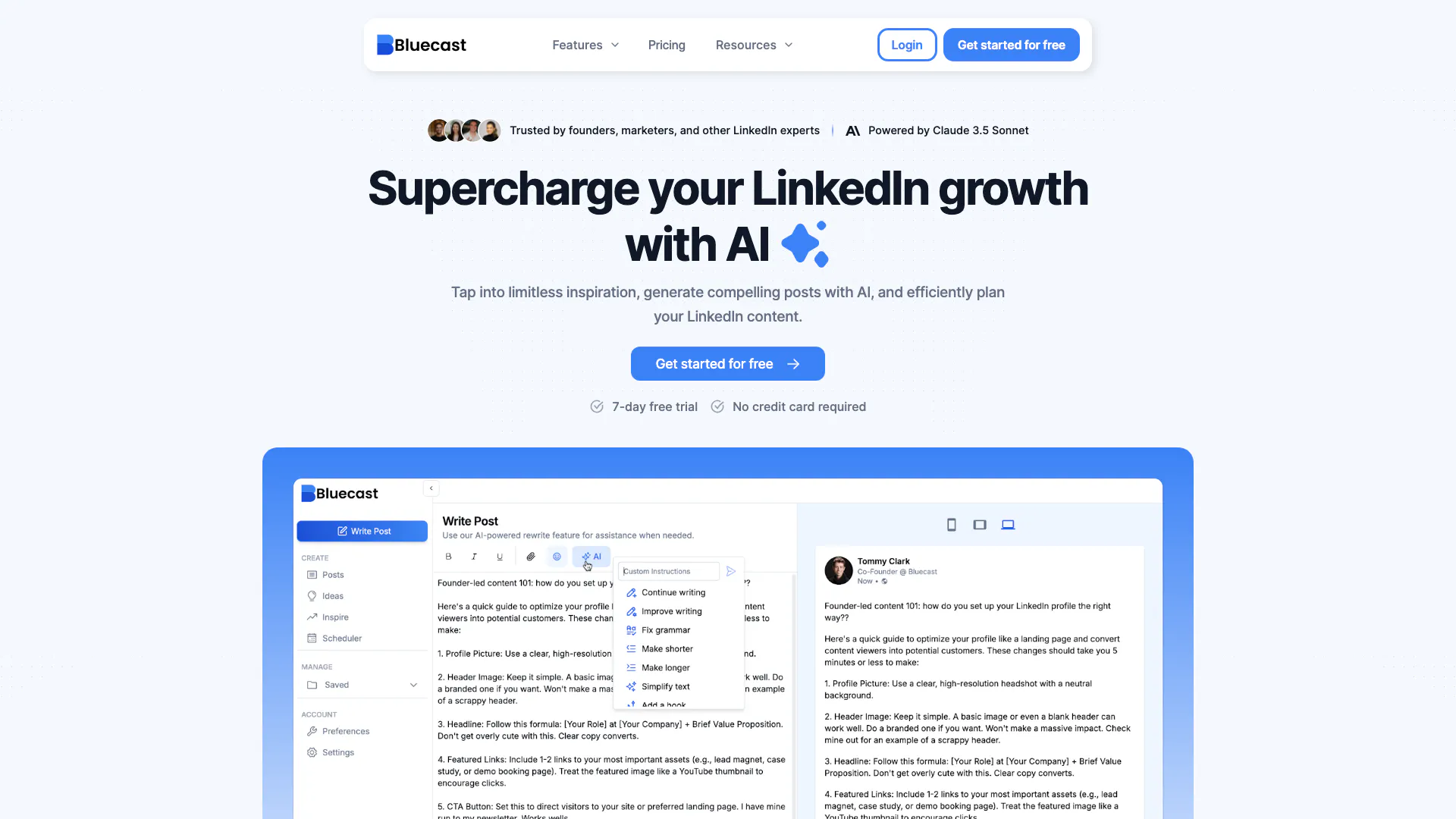 - AI-Powered Content Generation: Bluecast utilizes AI to generate engaging LinkedIn posts quickly, reducing the time spent on content creation.