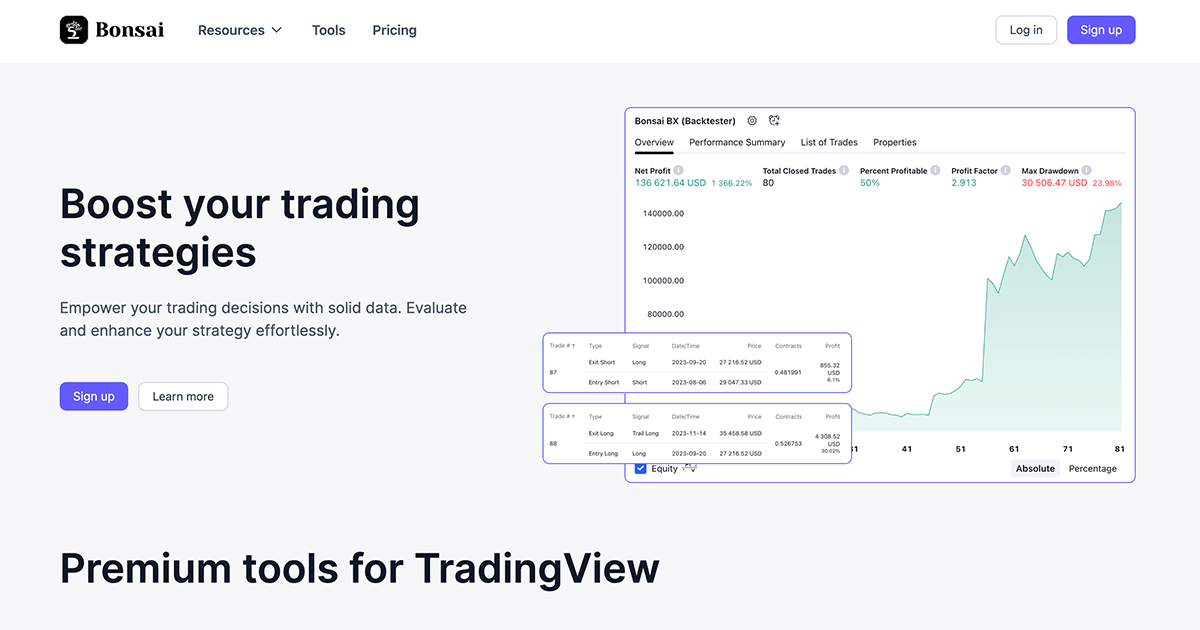 Bonsai Trade offers premium tools for TradingView, enhancing market analysis with advanced trader-focused features like indicators and backtesting tools.