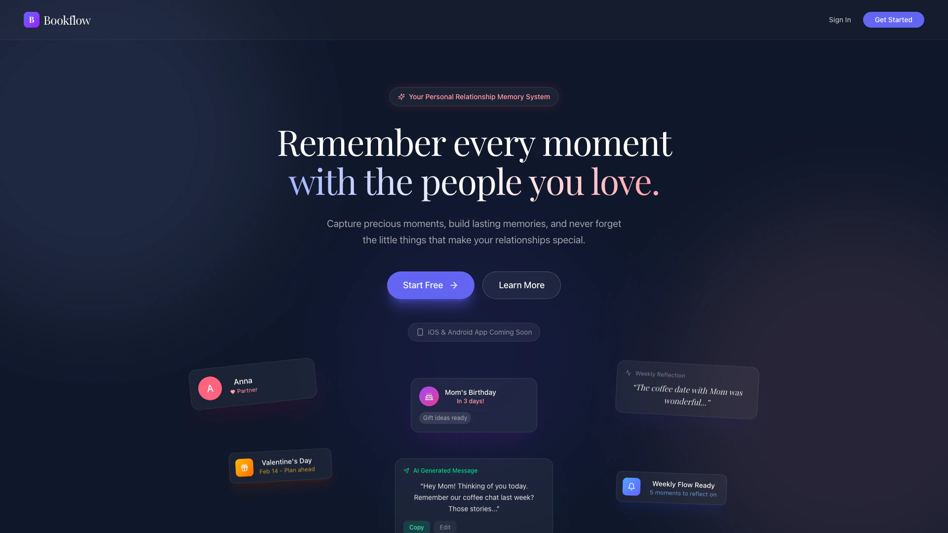 Bookflow is a personal relationship memory system[1] designed to help users capture and reflect on meaningful moments with loved ones. The tool emphasizes the importance of nurturing relationships by allowing users to document precious memories, express their feelings naturally, and appreciate the little things that make relationships special. With features like moment capturing, weekly reflections[3], and the ability to generate heartfelt messages[4], Bookflow aims to enhance personal connections in a simple and secure manner.