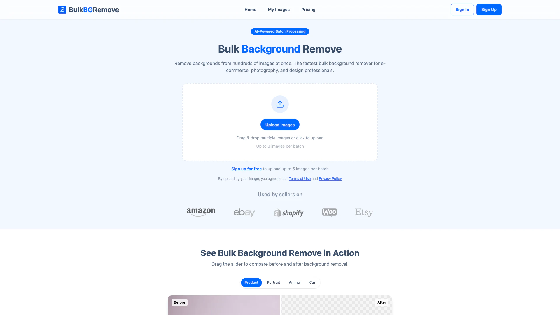- Drag and drop multiple images or click to upload images (up to 5 images per batch for free users).