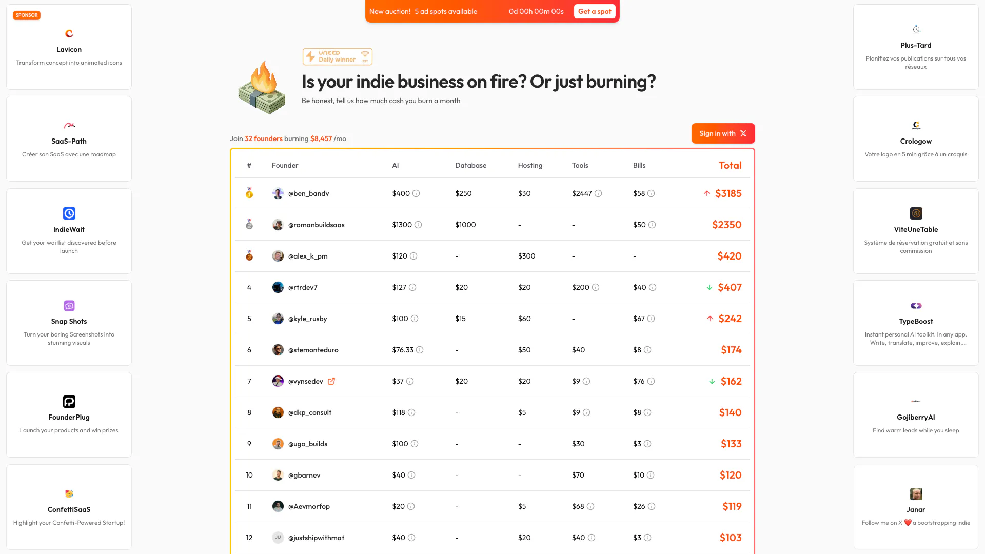 - Competitive Leaderboard: The platform features a leaderboard that encourages users to compete by minimizing their expenses, fostering a community of cost-conscious founders.