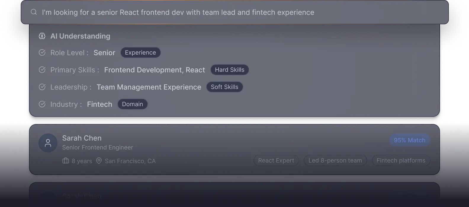 - Start Searching: Use natural language to search your database like an expert. Type in your requirements, and the AI will surface top-matching candidates in seconds.