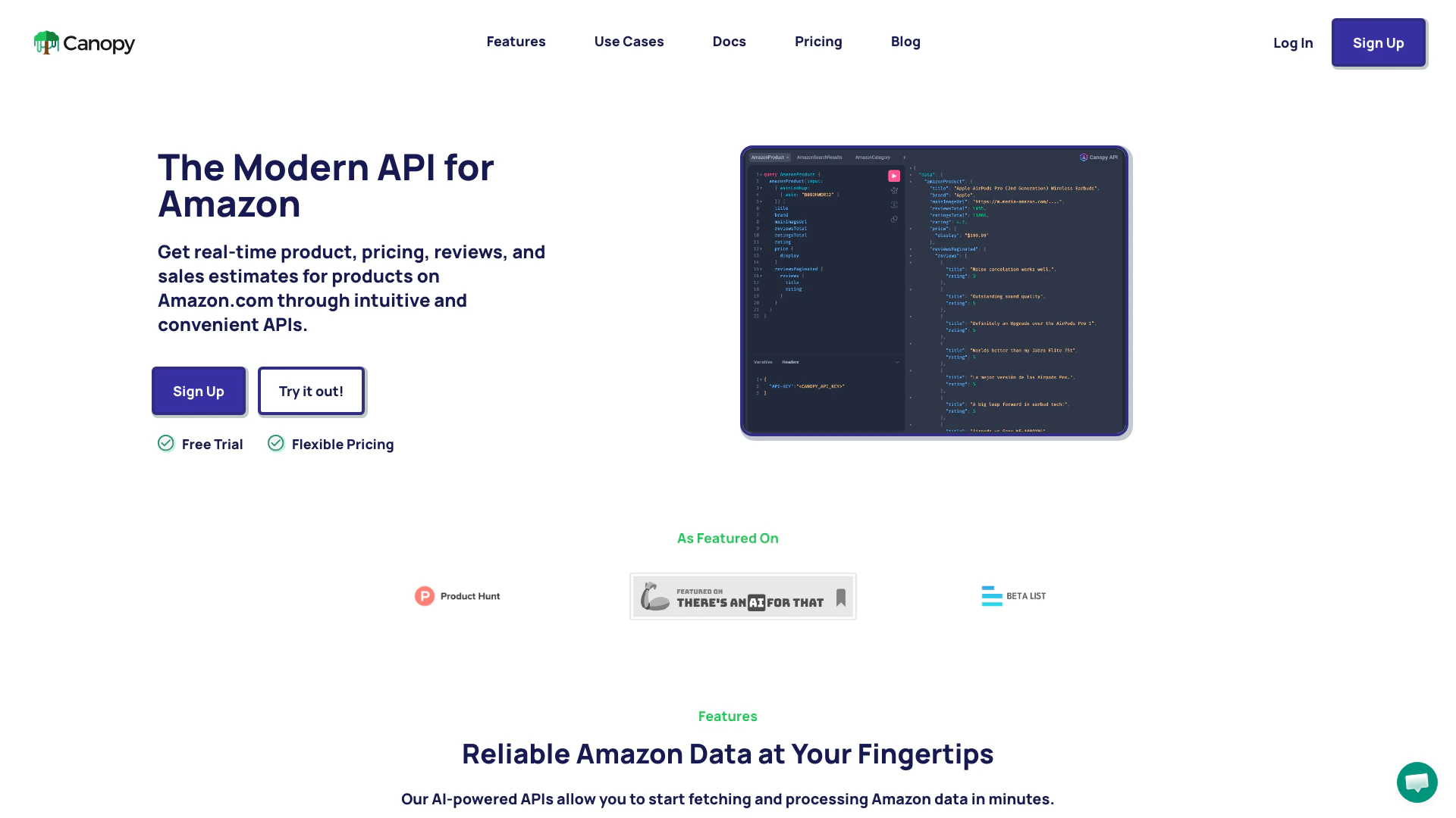 Canopyapi offers a variety of powerful features, including: - Product Data: Retrieve real-time product titles, descriptions, pricing, and stock estimations. - Product Reviews: Collect and analyze all reviews data to optimize your Amazon listings. - Search Functionality: Get product search results for specific keywords, enabling quick processing of search result rankings. - GraphQL and REST APIs: Use intuitive APIs that allow for easy data discovery and integration. - Scalability: The service scales with your usage, providing lower costs per request as your needs grow.