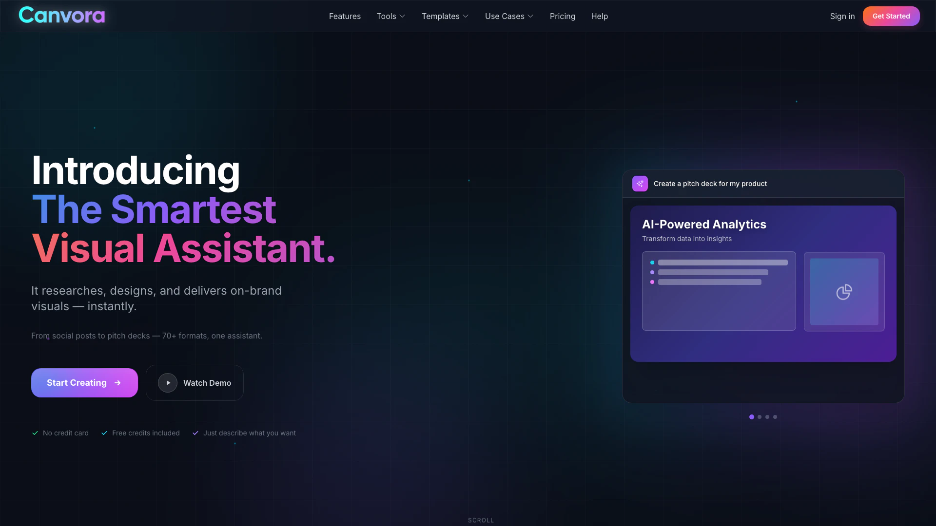 Canvoraai is an innovative AI-powered[1] visual assistant[2] designed to streamline the creation of various visual content formats. Users can easily upload files, paste URLs, or drop content into the platform, and in return, Canvoraai instantly generates social media posts, carousels, presentations, infographics, sales decks, ads, and over 70 additional visual formats. This tool eliminates the need for any design skills, making it accessible for everyone from content marketers to small business owners.