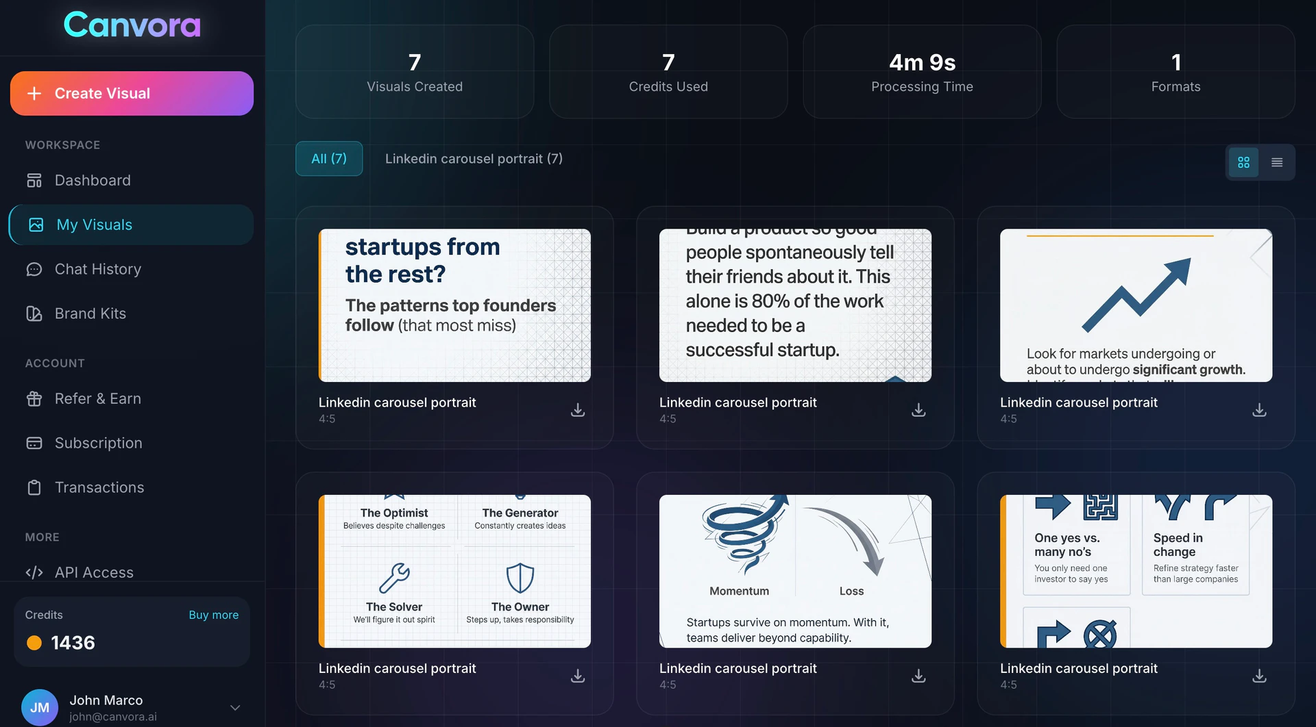 - Start by describing the visual you want to create in plain language, such as 'Create a LinkedIn carousel about productivity tips.' 2. If you have existing content, you can upload it directly by pasting a URL, uploading a PDF or document, or dropping in text. 3. If you don't have content, simply provide a topic, and the AI will research, write, and create stunning visuals for you. 4. Once the visuals are generated, you can download them in various formats such as PNG, JPG, PDF, PPTX, or WebP.