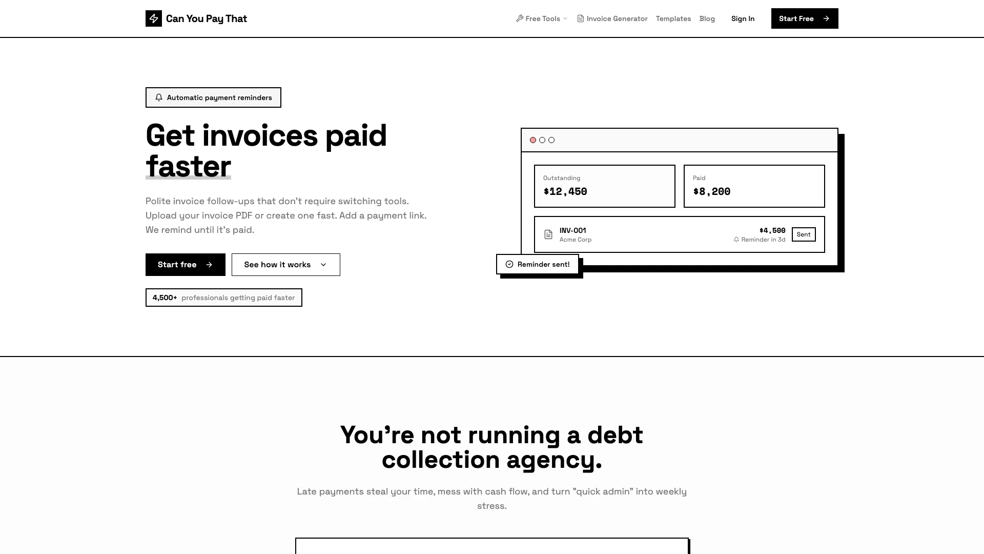 Canyoupaythat is an automated invoice management[1] tool designed to help professionals and businesses streamline their invoicing process. It simplifies the task of getting invoices paid on time by sending polite, automated reminders to clients without the need for manual follow-ups. By allowing users to create or upload invoices, add payment links, and manage reminders all in one platform, Canyoupaythat ensures that users can focus more on their work and less on chasing payments. This tool is particularly beneficial for service-based businesses, freelancers, and agencies that send invoices regularly.