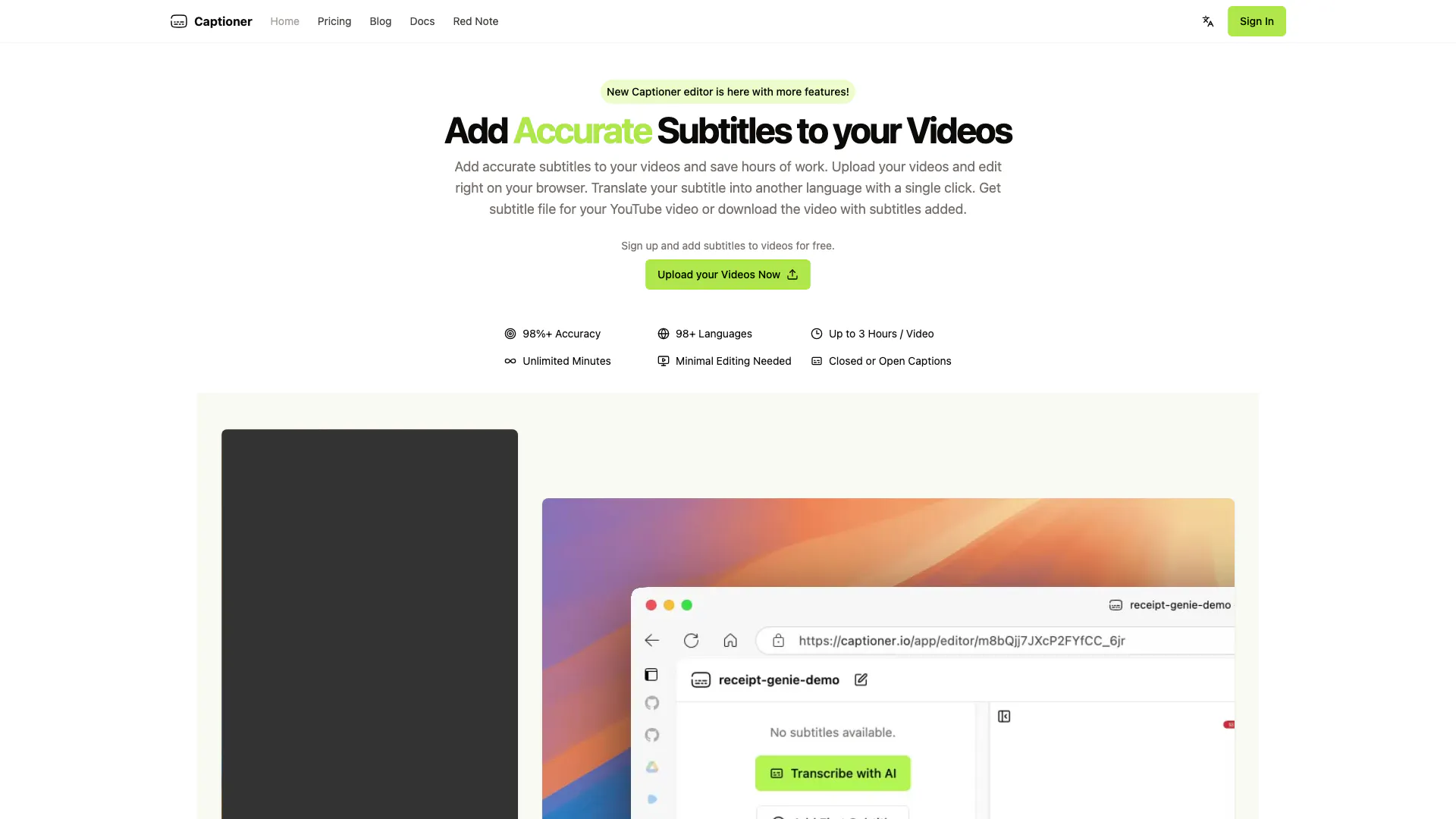- High Accuracy Transcription: Captioner uses advanced AI technology to provide over 98% accuracy in transcribing videos, ensuring high-quality subtitles.