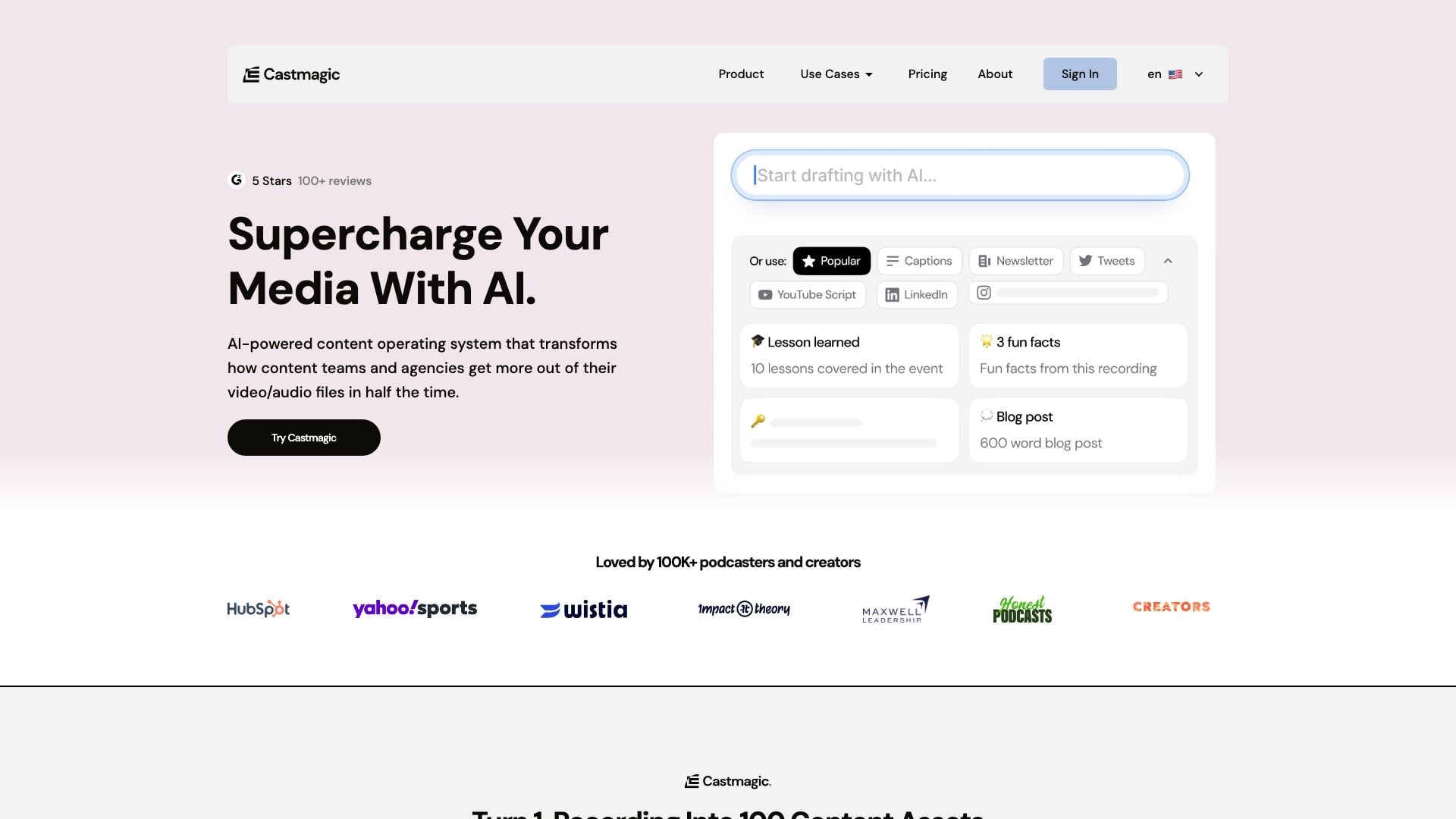 - AI-Powered Efficiency: Castmagic transforms video and audio files into various content assets quickly, reducing content creation time by up to 70%.