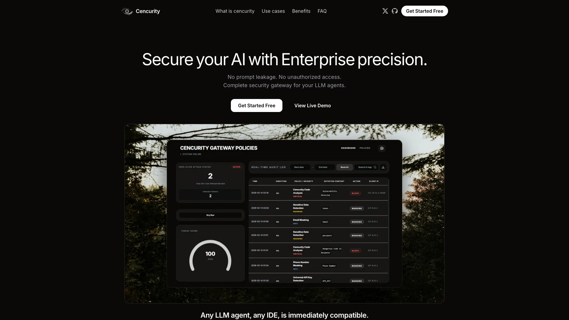 Cencurity is a comprehensive security solution[1] designed specifically for AI developers[2], providing a centralized security gateway[3] that ensures enterprise-level protection for large language model[4] (LLM) agents. It prevents prompt leakage[5] and unauthorized access, making it essential for organizations that prioritize data security in their AI applications. With Cencurity, users can seamlessly integrate their existing AI agents and IDE workflows, ensuring consistent behavior across different models and tools without the need for extensive rewrites. The platform features a centralized security dashboard that allows real-time monitoring of agent calls, including requests, responses, and latency, ensuring that sensitive information is protected at all times.