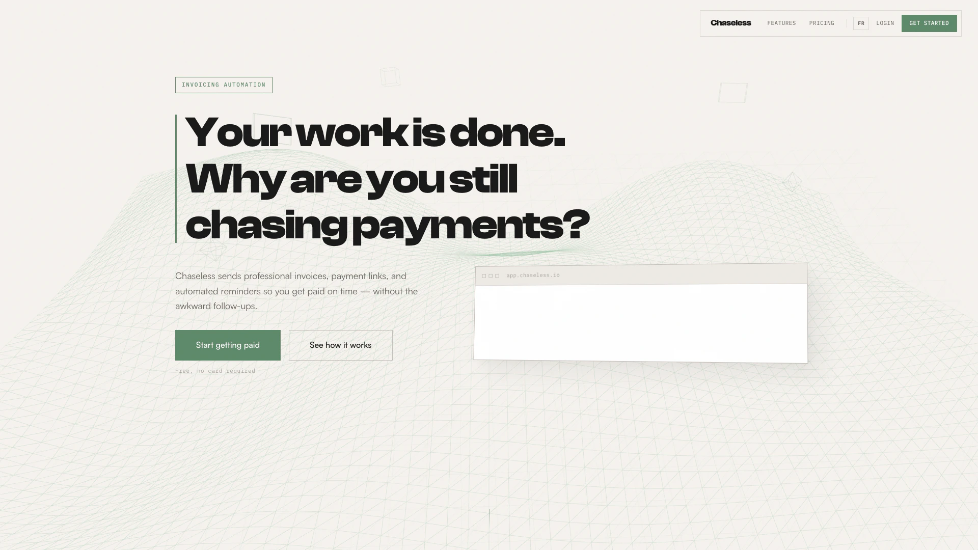 Chaseless is an innovative invoicing[1] tool designed specifically for freelancers, agencies, and small businesses. It streamlines the invoicing process by enabling users to send professional invoices[4], collect payments through Stripe, and automate payment reminders. With a focus on reducing the hassle of chasing payments, Chaseless empowers users to get paid on time without the awkward follow-ups, allowing them to focus on their core work.