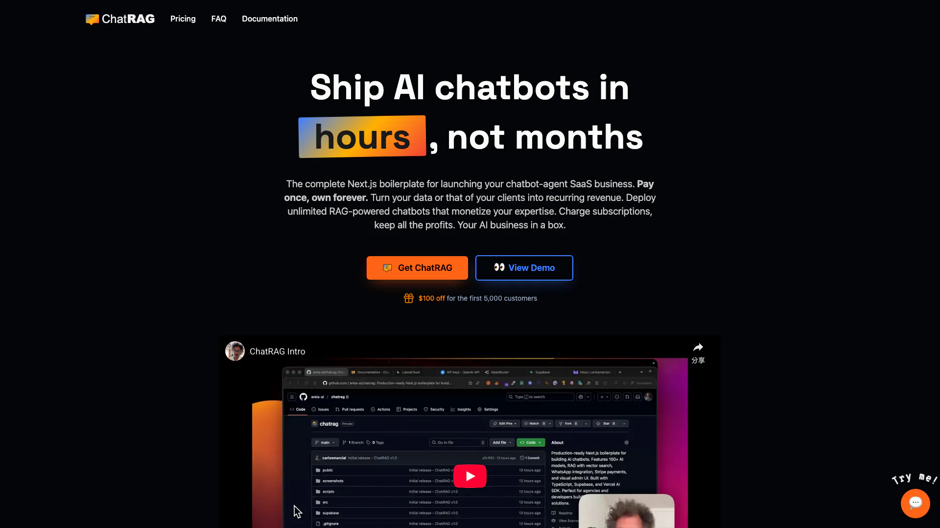 - Quick Deployment of Chatbots: ChatRAG allows users to launch AI chatbots in hours instead of months, streamlining the development process with a complete Next.js boilerplate.