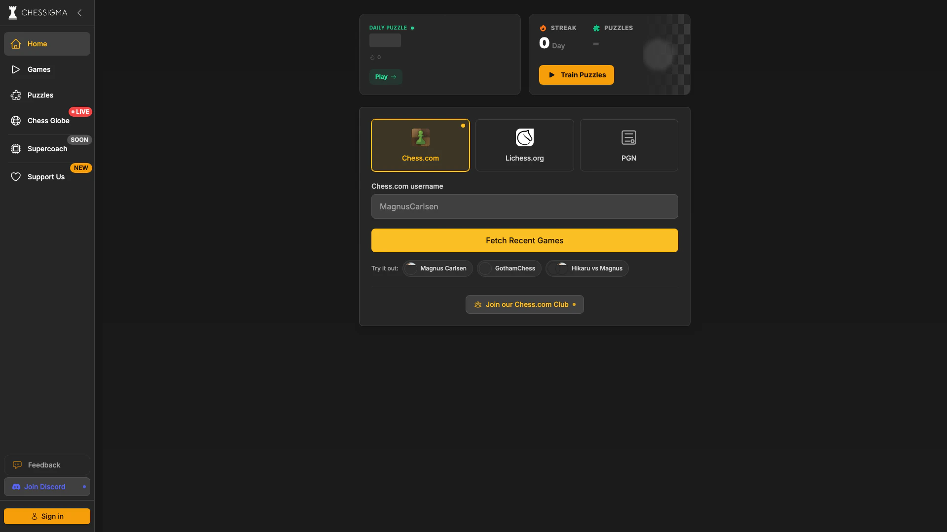 - Enter your Chess.com or Lichess username in the designated field to fetch your recent games automatically.