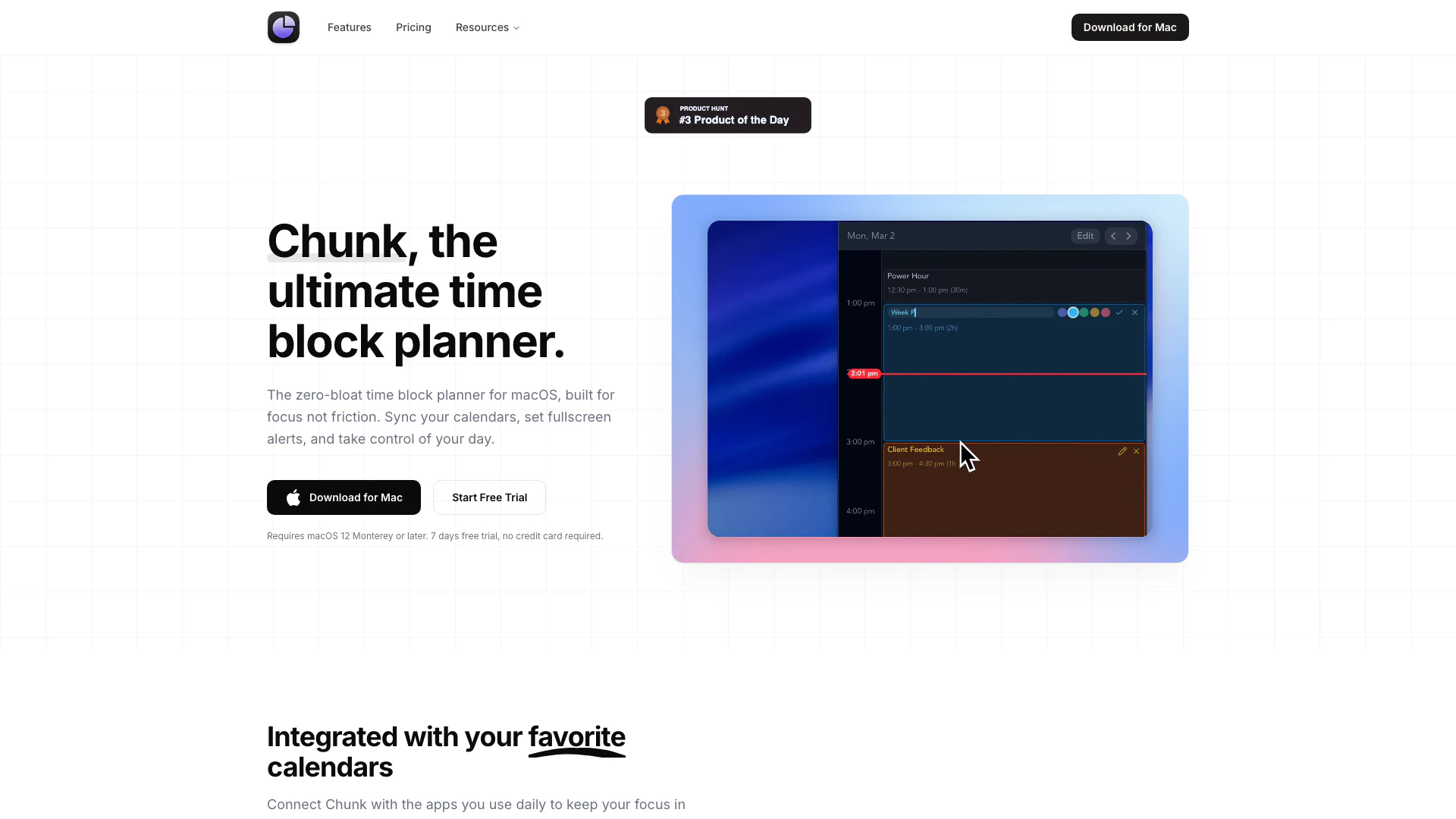 - Calendar Integration: Chunk seamlessly integrates with Apple, Google, and Outlook calendars, allowing users to manage their time blocks in sync with their existing schedules.