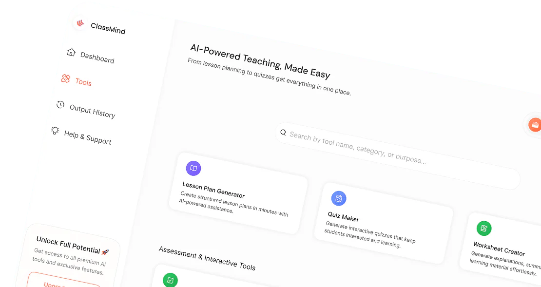ClassMind offers 40+ AI tools specifically designed for educators, and we're constantly adding more based on educator feedback. Our tools are organized into comprehensive categories: • Planning Tools - Lesson plans, unit plans, project-based learning • Assessment Tools - Quizzes, worksheets, rubrics, test items • Content Generation Tools - Presentations, vocabulary lists, informational texts • Text Processing Tools - Text rewriter, summarizer, translator, leveler • Communication Tools - Professional emails, letters of recommendation • Feedback Tools - Report card comments, writing feedback • Academic Analysis Tools - Essay grading, literature analysis • Academic Integrity Tools - Plagiarism detection and prevention. Can't find what you need? Just click the 'Request a Tool' button in your dashboard!