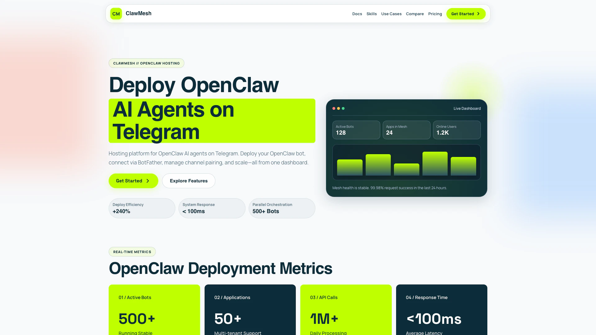ClawMesh allows you to effortlessly deploy and manage OpenClaw AI agents on Telegram with a streamlined setup and integration process.