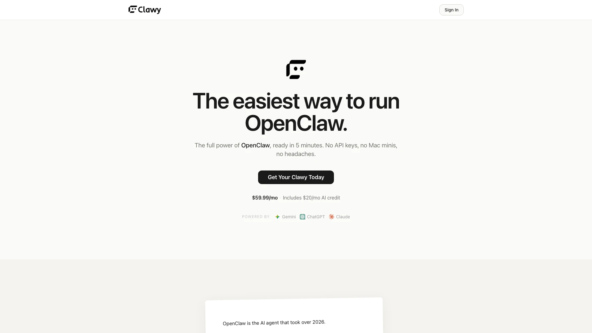 Clawyai is a user-friendly platform designed to run your own OpenClaw AI agent effortlessly in just five minutes. It eliminates the need for technical expertise, managing servers, or handling API keys, making it accessible to everyone. With Clawyai, you can interact with your AI agent via Telegram, enabling it to perform tasks like reading emails, booking flights, and managing your calendar. Priced at $59.99 per month, which includes a $20 monthly AI credit, Clawyai simplifies the process of deploying an AI agent, allowing users to focus on productivity rather than technical setup.