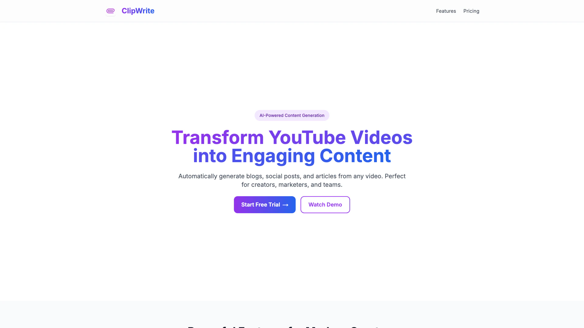 ClipWrite is an innovative AI-powered[1] tool designed to transform videos from platforms like YouTube, Spotify, Instagram, and TikTok into SEO-friendly[3] blog posts, engaging Twitter threads, and professional LinkedIn articles. By automating the content generation[2] process, ClipWrite helps users boost their content marketing efforts effortlessly, making it an ideal solution for creators, marketers, and teams looking to streamline their workflow.