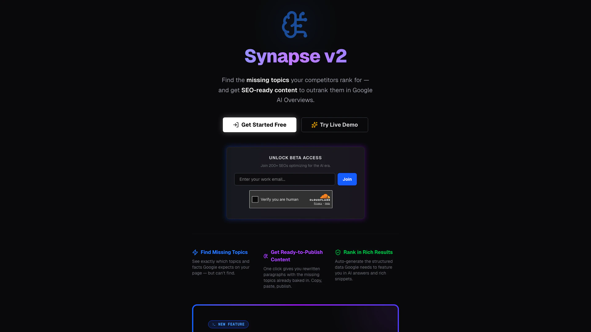 Cloudnerve, specifically its Synapse tool, is an advanced SEO optimization[1] platform designed to help users identify content gaps[2] and enhance their rankings in Google AI Overviews. By comparing your content against high-performing competitors, Synapse reveals missing topics[3] that are crucial for SEO success. It generates SEO-ready rewrites and structured data, allowing users to create content that aligns with Google's expectations, ultimately driving more traffic and improving visibility in search results.