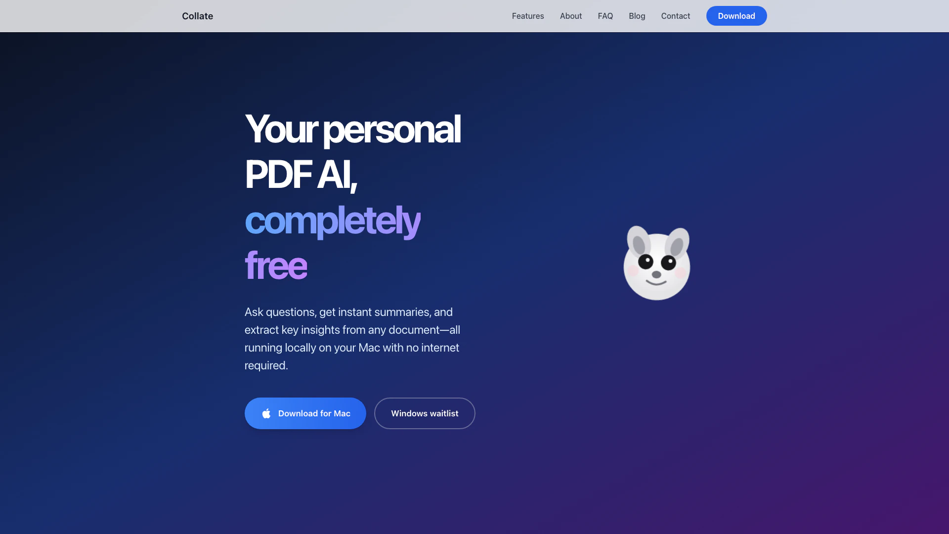 Collate is a powerful Mac application designed to facilitate interaction with PDF documents. It allows users to chat with their PDFs, generate summaries, and extract key insights, all while ensuring complete privacy by operating entirely offline. This means that users can access and utilize the tool without needing an internet connection, making it a convenient and secure option for handling sensitive documents. Collate is free to download and use, making it accessible for anyone looking to enhance their document processing capabilities.