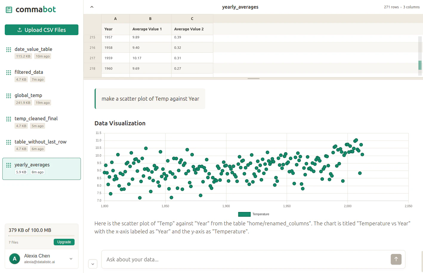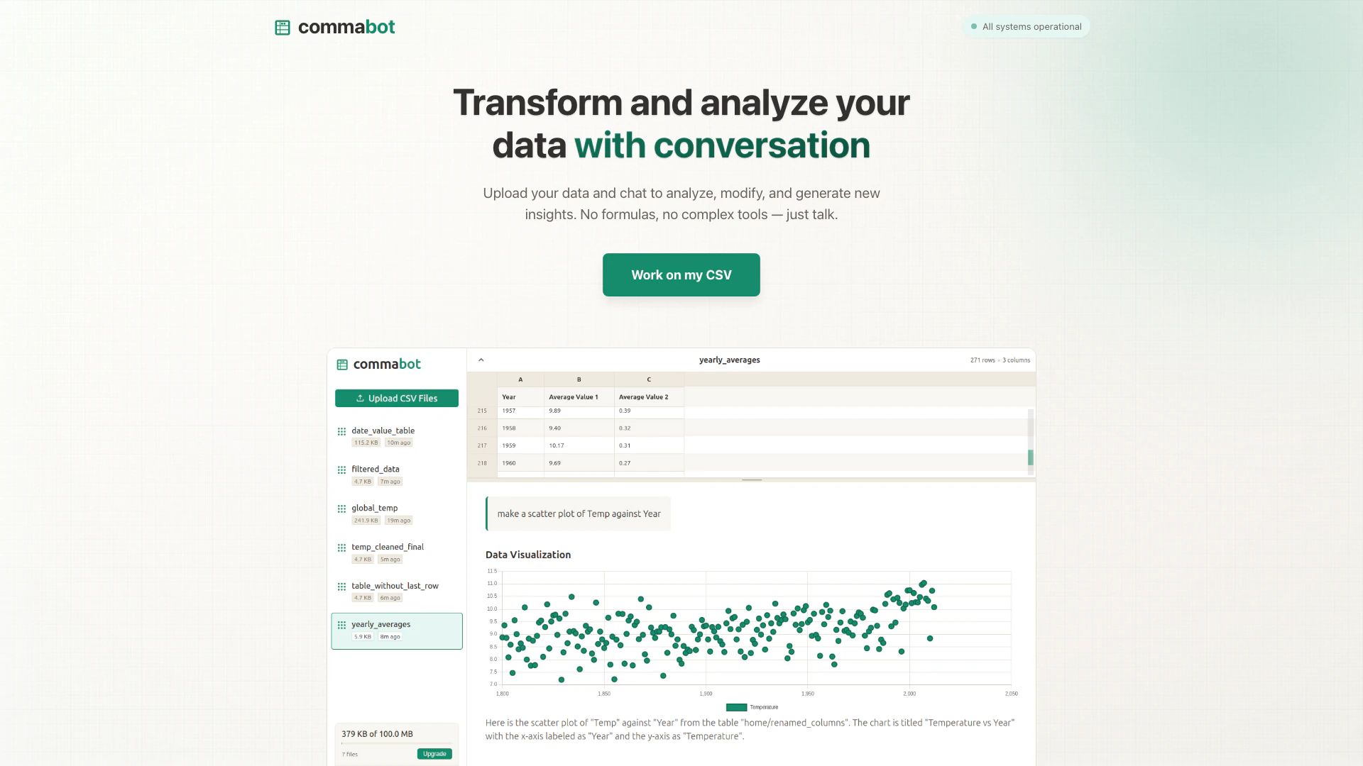 Commabot is an innovative data analysis[1] tool designed to simplify the process of transforming and analyzing data through conversational interaction. By allowing users to upload their data, particularly in CSV format, Commabot enables users to chat with the system to generate insights, modify data, and create visualizations without needing complex formulas or tools. It positions itself as a user-friendly alternative for data practitioners, making data analysis accessible to those who may not have extensive technical expertise.