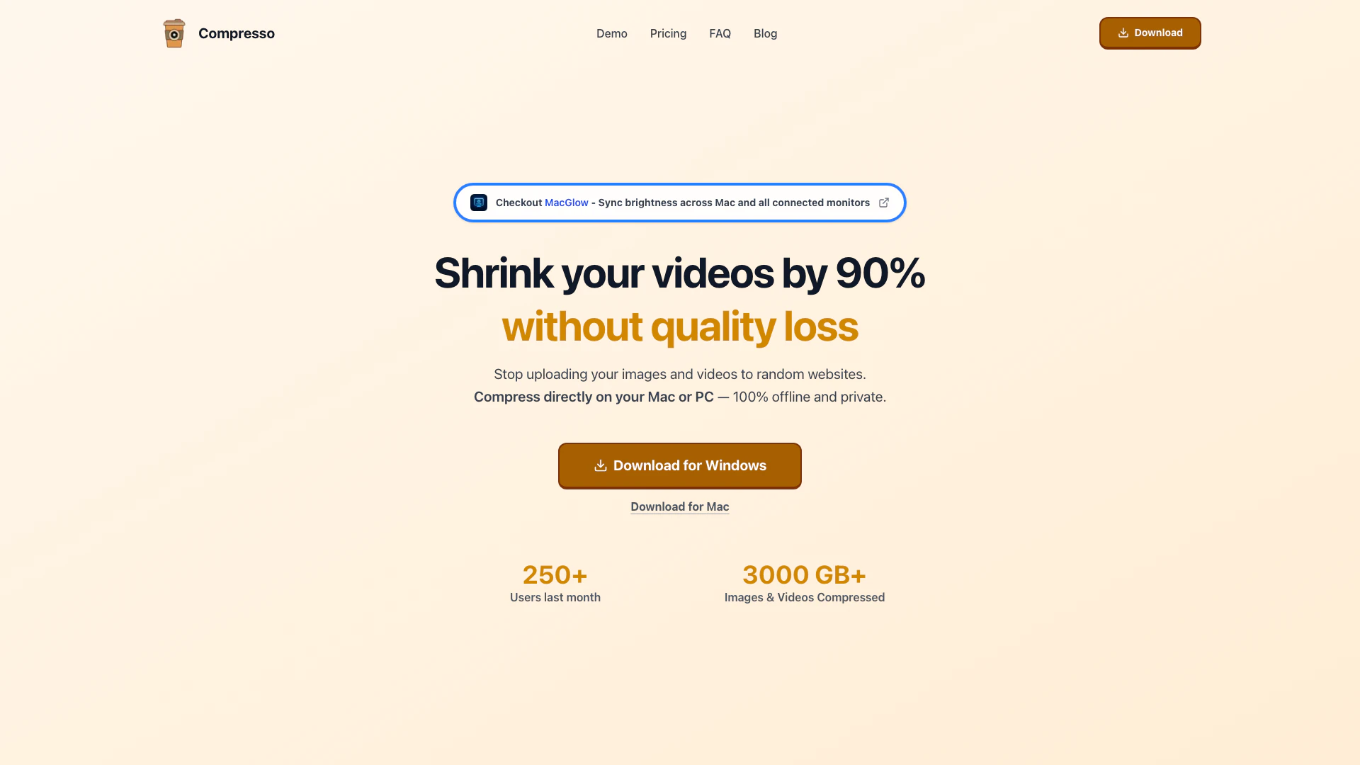 - Offline and Private Compression: Compresso operates 100% offline, ensuring that users' media files remain private and secure during the compression process.