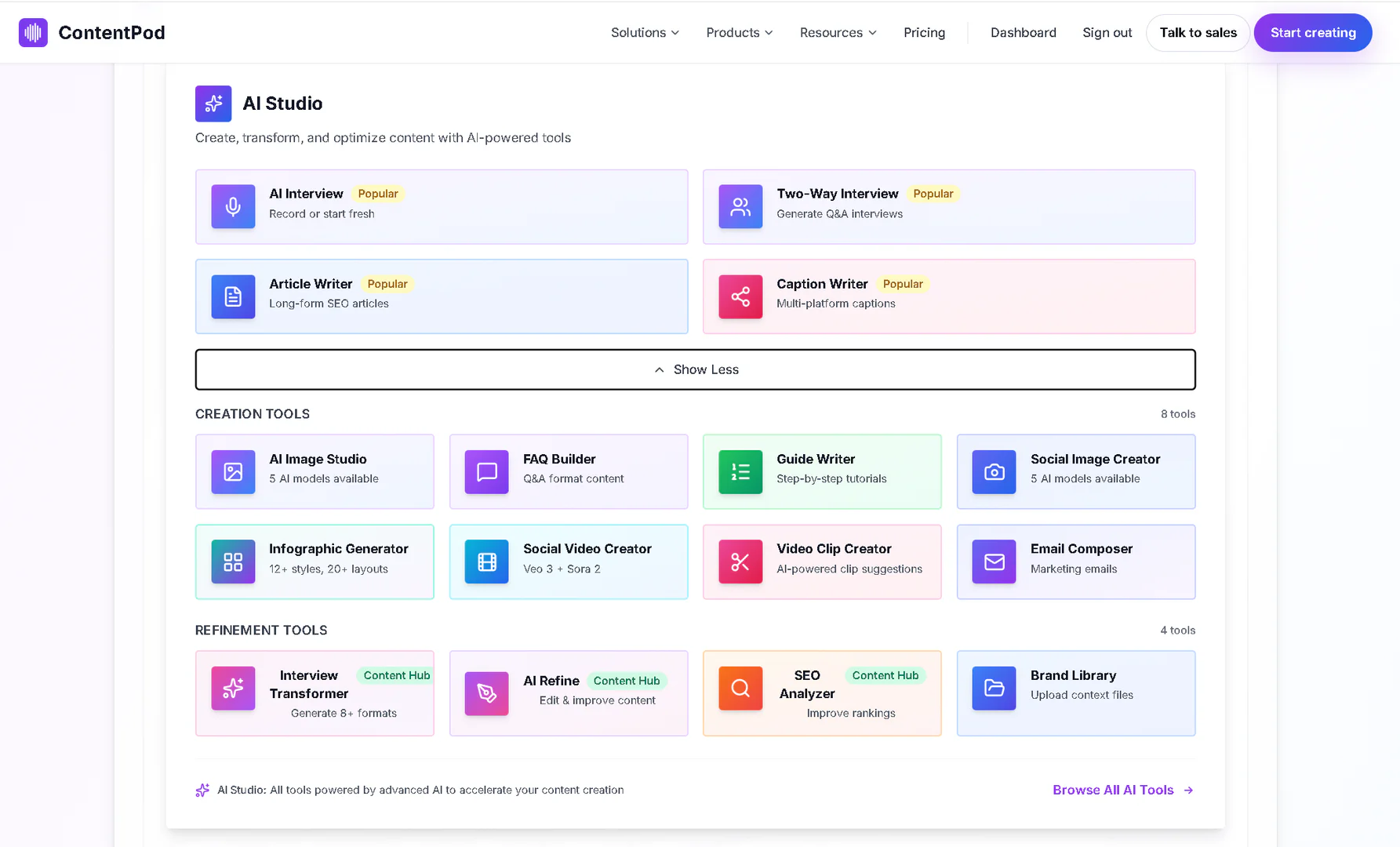 ContentPod is an innovative content creation[1] platform that utilizes over 17 AI tools[2] to generate various types of content, including blogs, social media posts, images, and videos. Designed for modern content teams, ContentPod enables users to transform voice interviews[3] into more than eight different content formats, making it a versatile solution for anyone looking to enhance their content production capabilities. With features powered by advanced AI models such as GPT 5.2 and Vertex AI, ContentPod allows users to create and optimize content efficiently, saving significant time and effort.