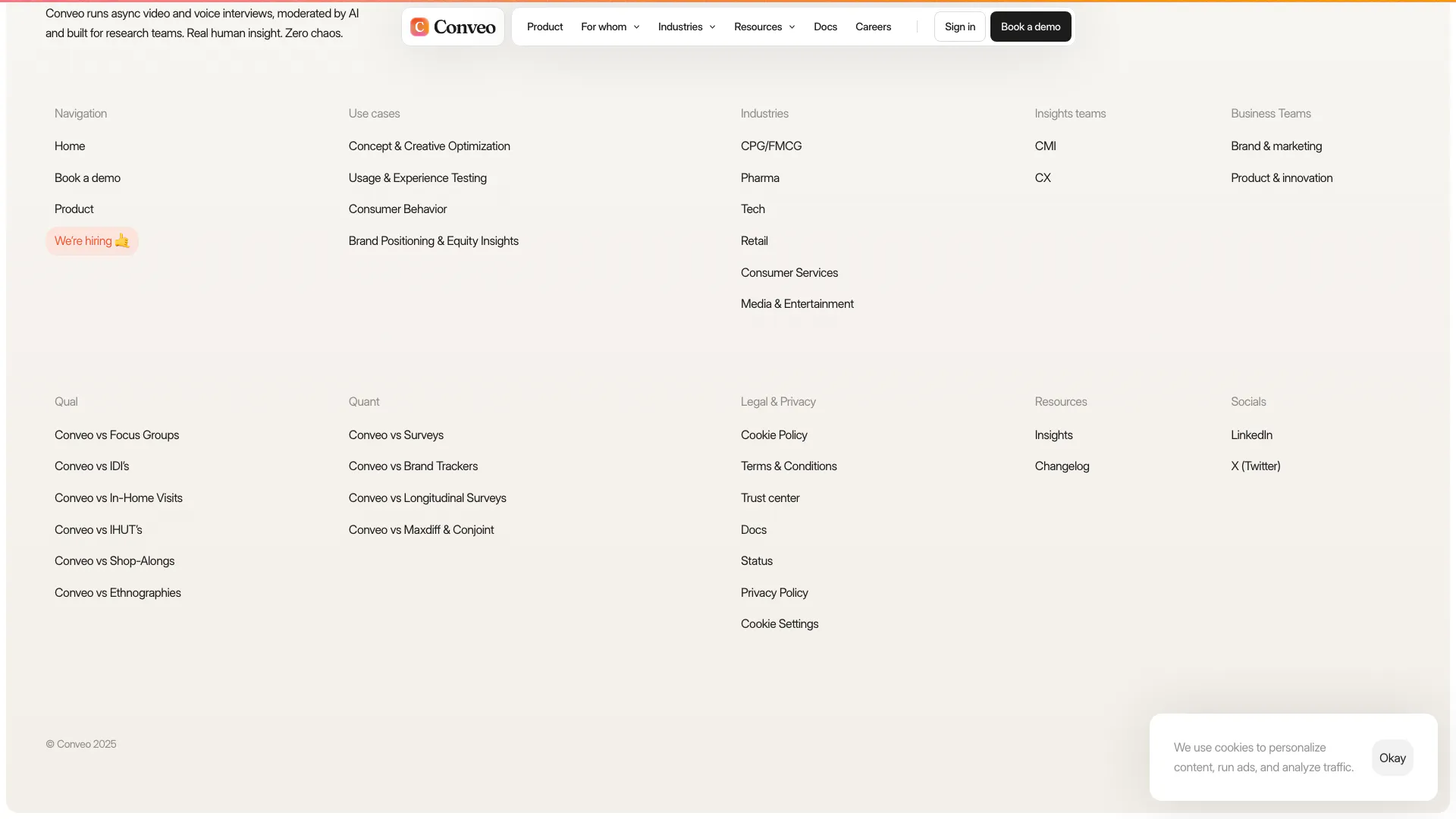 Conveoai is designed for researchers, marketers, product teams, and businesses that require in-depth qualitative insights into consumer behavior. It is particularly beneficial for industries such as consumer packaged goods, technology, healthcare, and retail, where understanding the nuances of customer feedback is crucial. Teams looking to streamline their research processes and gain actionable insights quickly will find Conveoai to be an invaluable tool.