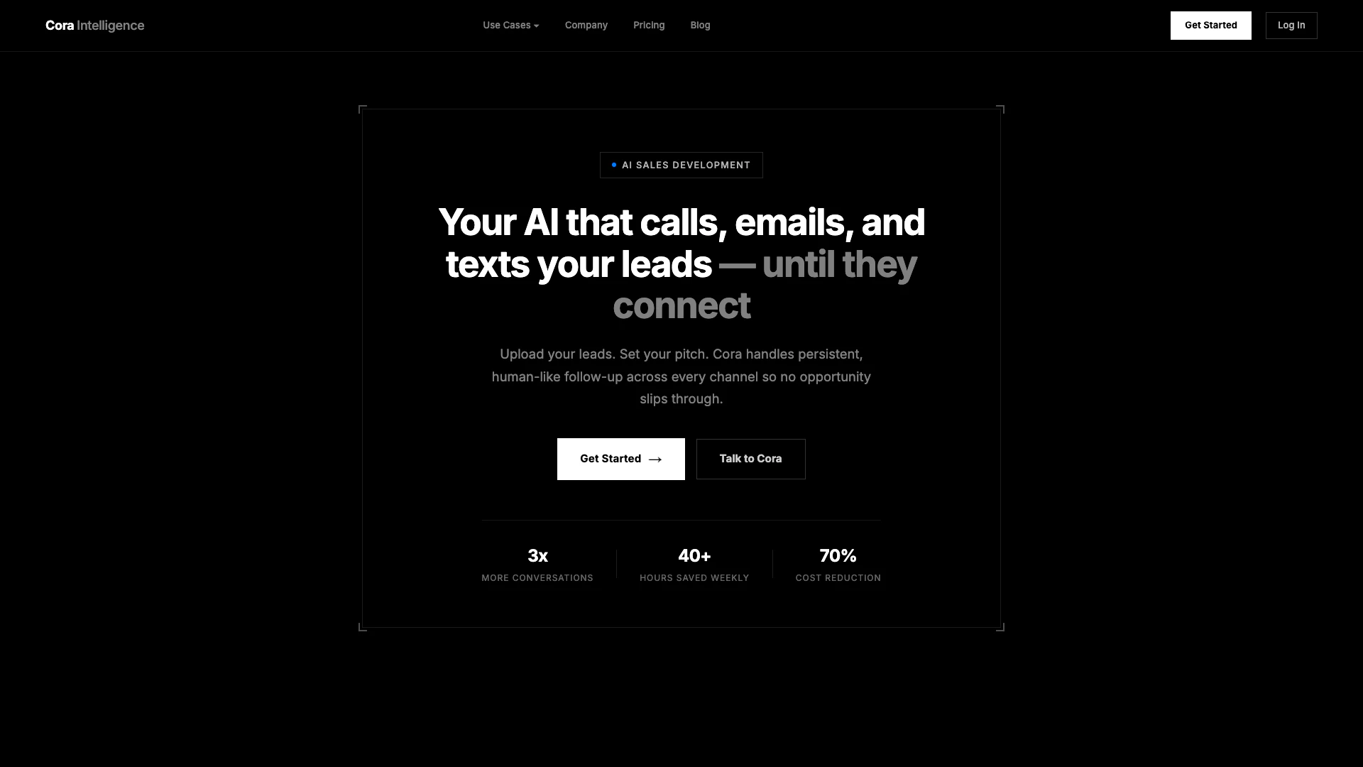 Cora Intelligence is an advanced AI-powered[1] sales development[2] tool designed to automate outreach[3] processes through phone calls[4], emails[5], and text messages[6]. This innovative system ensures persistent and human-like follow-up with leads, effectively transforming how businesses engage potential customers. By combining multiple outreach channels into one cohesive platform, Cora aims to maximize lead conversion rates while saving time and reducing costs. With features that allow for natural conversations, personalized email sequences, and instant SMS responses, Cora Intelligence provides a comprehensive solution for sales teams looking to enhance their lead generation efforts.