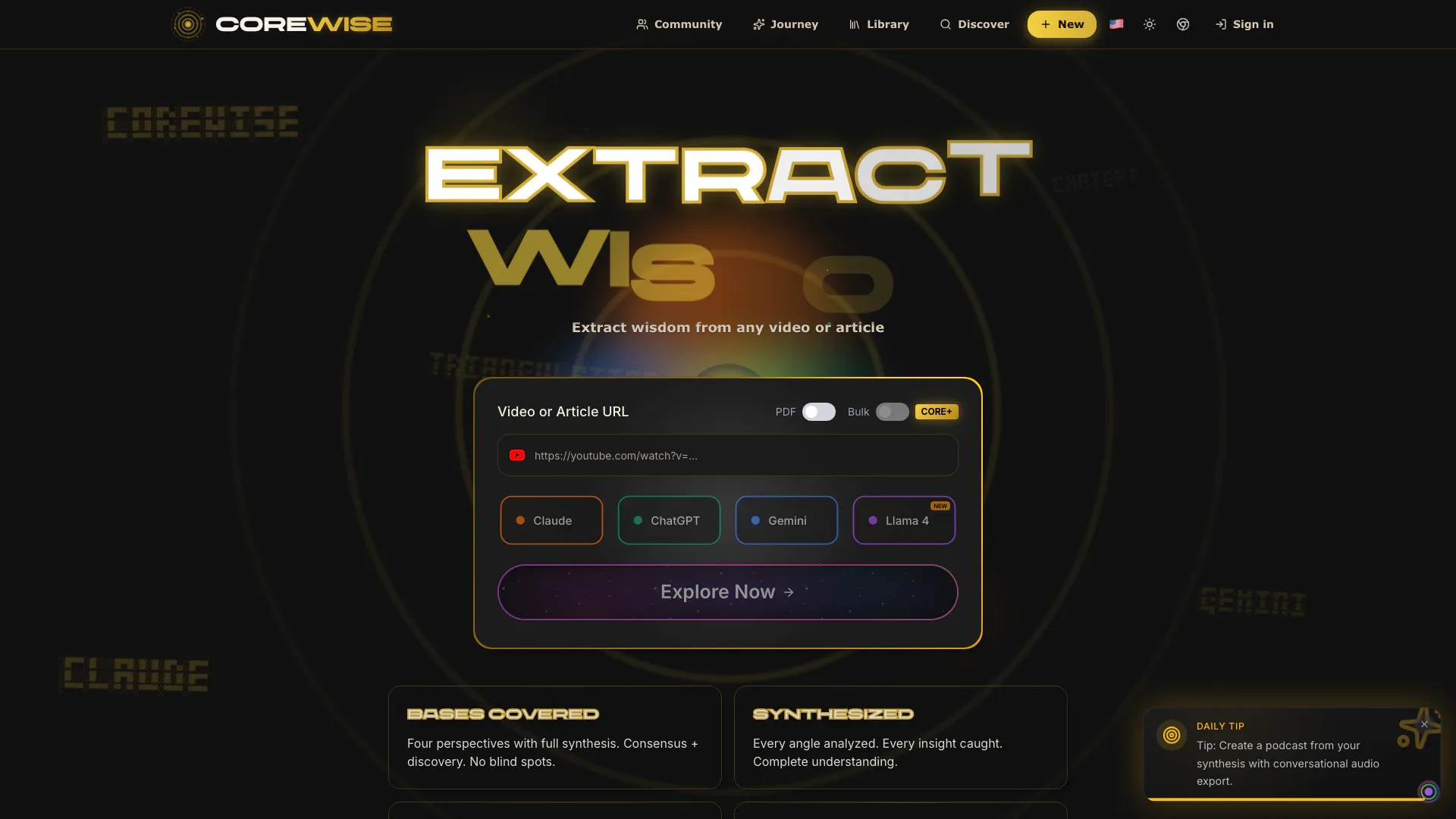 CoreWise is an innovative AI-powered tool designed to extract wisdom from various content formats, including videos, podcasts, and articles. Utilizing three advanced AI models[1]—Claude[2], Gemini[3], and ChatGPT[4]—CoreWise synthesizes insights, delivering key takeaways and actionable wisdom in seconds. This tool not only highlights essential information but also provides a question and answer format, making it easier for users to grasp complex ideas quickly. With a free tier that allows for ten extractions per month, CoreWise aims to enhance learning and comprehension without any financial commitment.