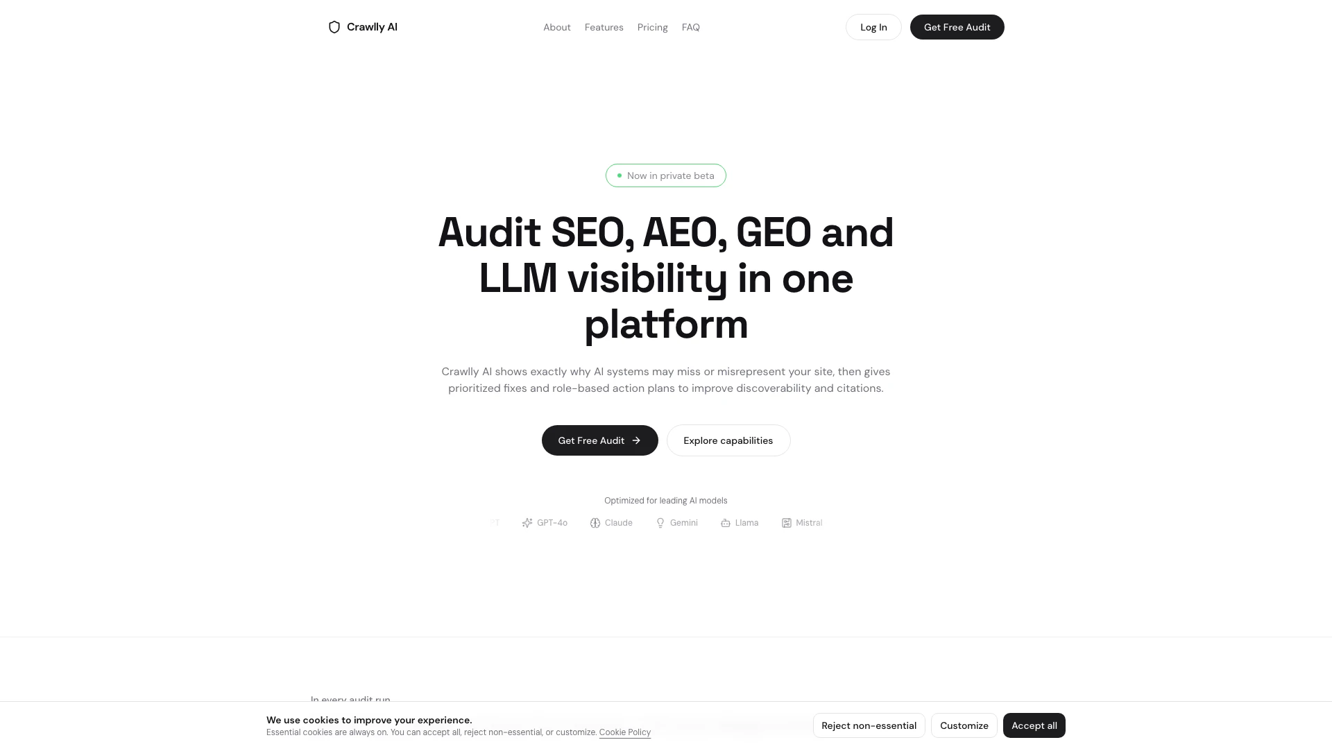 - Comprehensive Visibility Audits: Crawlly AI provides a unified platform for auditing SEO, AEO, GEO, and LLM visibility, ensuring a thorough analysis of your site's performance.