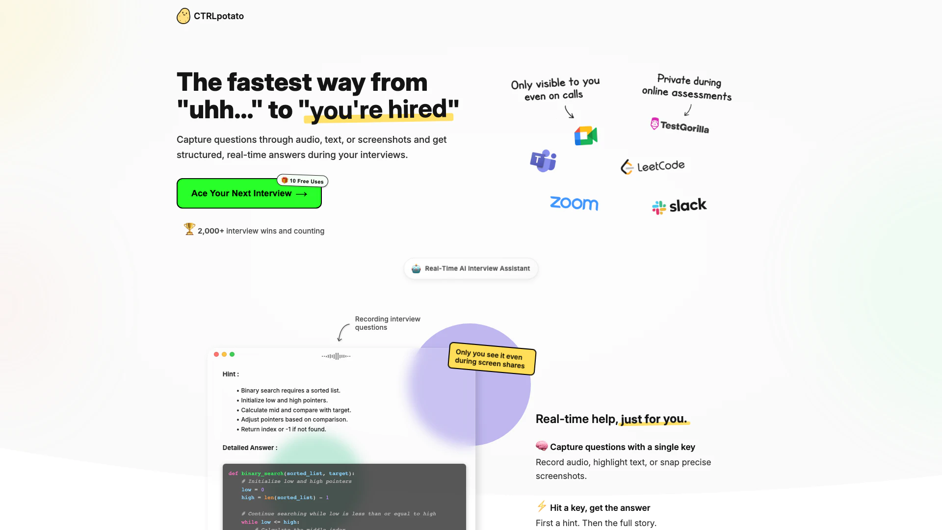 - Technical Interviews: Use CTRLpotato to capture and answer coding questions effectively during technical interviews, ensuring you can provide accurate solutions quickly.