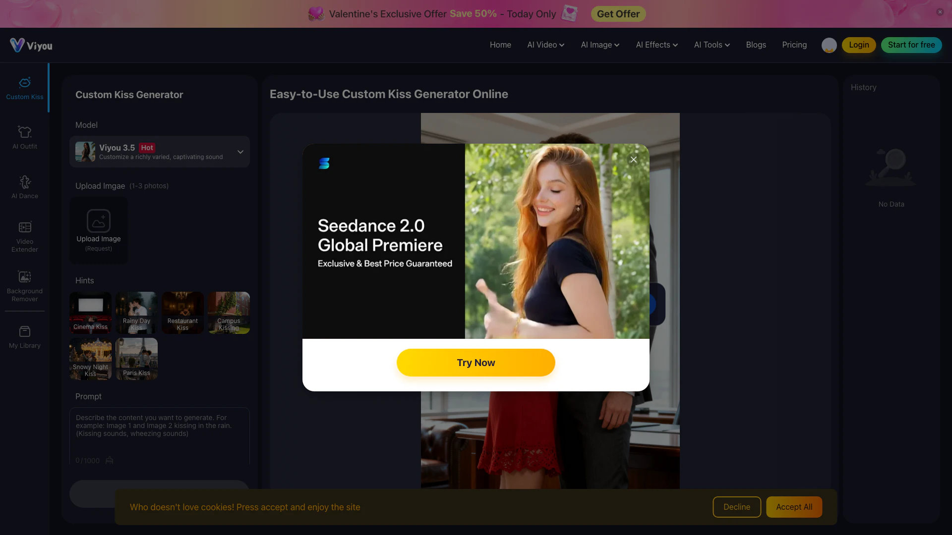 The Custom Kiss Generator is a specialized tool within Viyou's unrestricted AI video generator suite. It allows you to upload photos of different individuals and a background to create highly realistic, cinematic kissing animations using our advanced Viyou 3.5 engine.