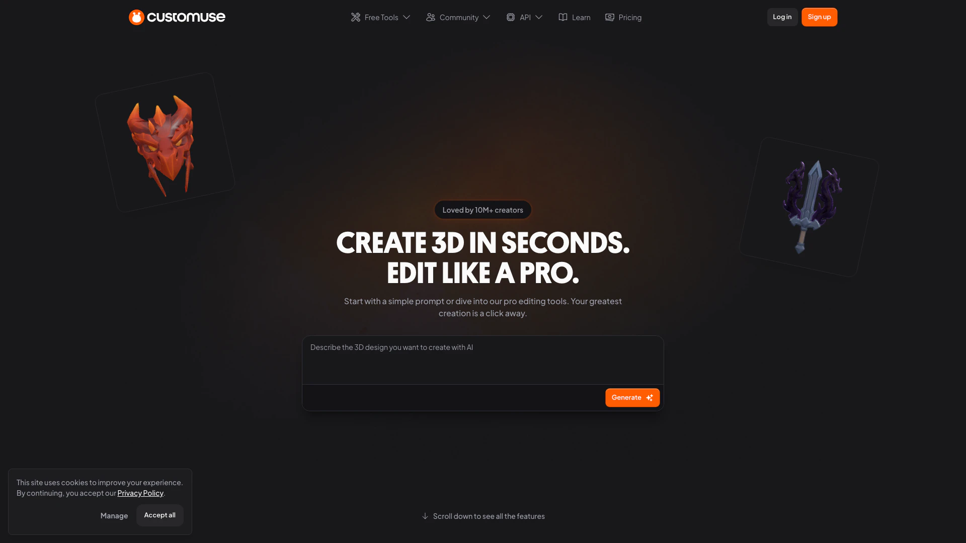 Customuse is an innovative platform designed for creating, sharing, and exploring custom designs, particularly in the realm of 3D modeling. It caters to a diverse audience, including designers, artists, and enthusiasts, providing them with powerful tools and a vibrant community to transform their ideas into reality. The platform emphasizes accessibility, allowing users to generate 3D designs effortlessly, whether through text prompts or image references. Customuse aims to democratize 3D creation, making it easier for anyone to bring their creative visions to life.