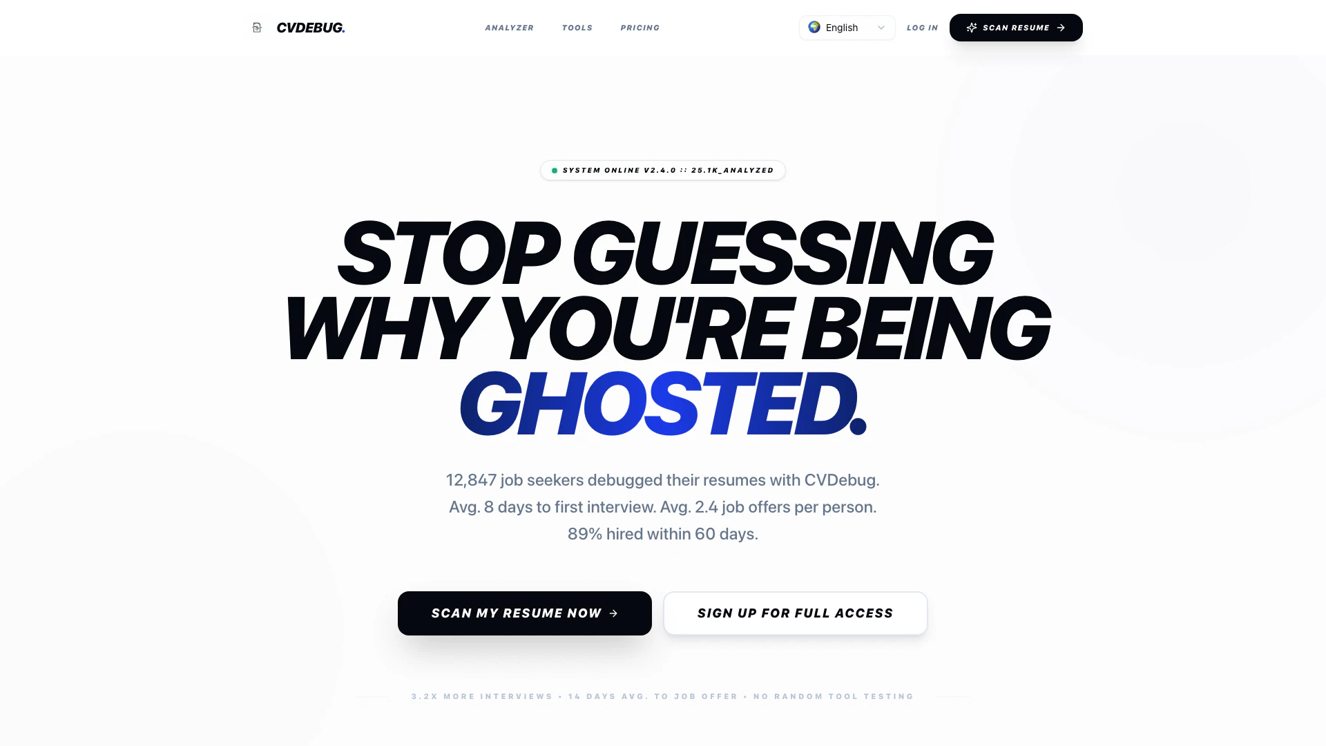 The scan speed difference is night and day. With Jobscan I'd wait 45 seconds per scan. CVDebug is instant. Made optimizing my resume for 20+ job applications actually feasible.