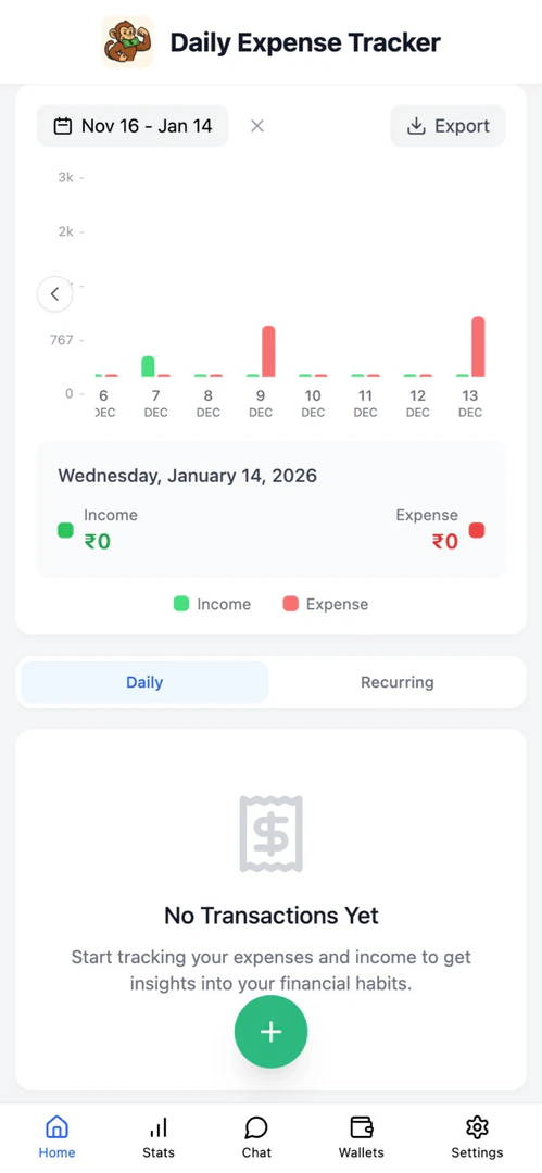 - Start adding your expenses by either manually entering them or using the AI chat feature to track your spending through natural conversation.